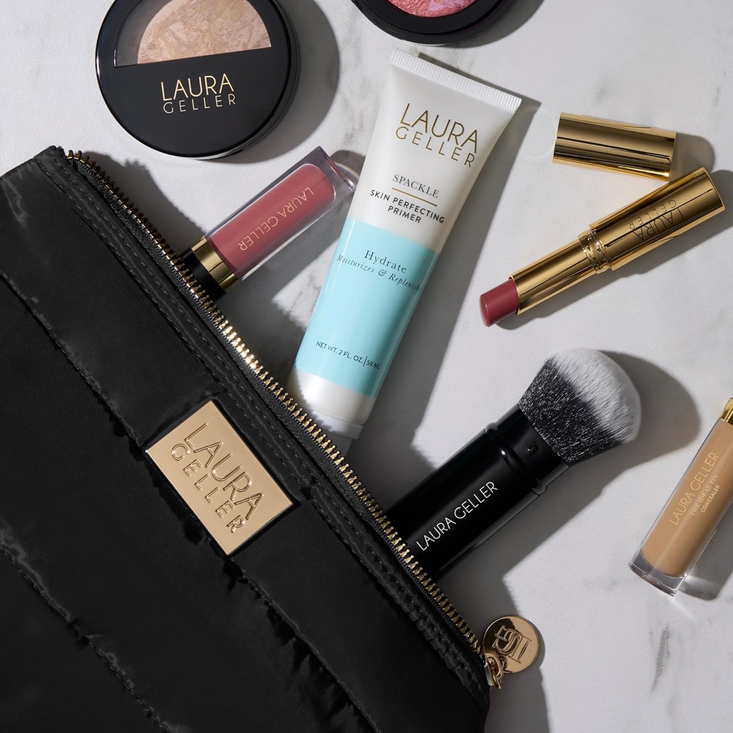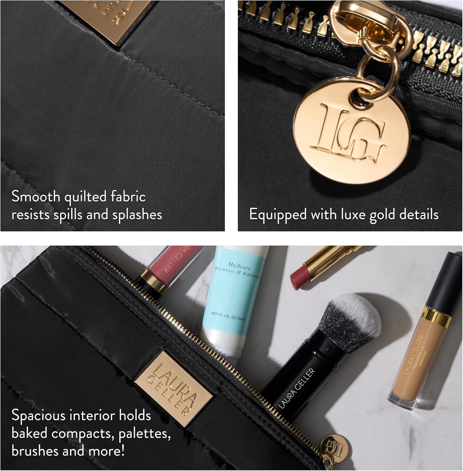 - CONVENIENT DESIGN: The luxe gold details are a Geller-gorgeous touch that matches the secure zippers. Spacious size holds all your Laura Geller baked makeup compacts and more!