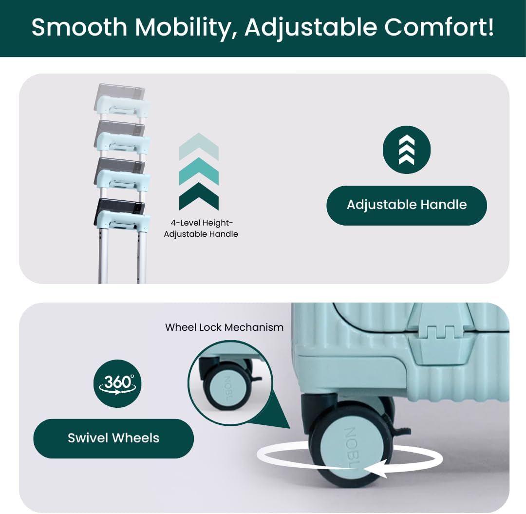 Nobl Travel Carry On Luggage, Noble Zipperless Aluminum Frame PC Hard Shell Suitcase, 22.5x15x9.5 Airline Approved, 360° Spinner Wheels, TSA Locks, USB Charging Port, Cup & Phone Holder - Baby Blue