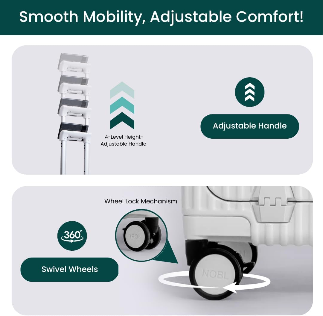 Nobl Travel Carry On Luggage, Noble Zipperless Aluminum Frame PC Hard Shell Suitcase, 22.5x15x9.5 Airline Approved, 360° Spinner Wheels, TSA Locks, USB Charging Port, Cup & Phone Holder - White
