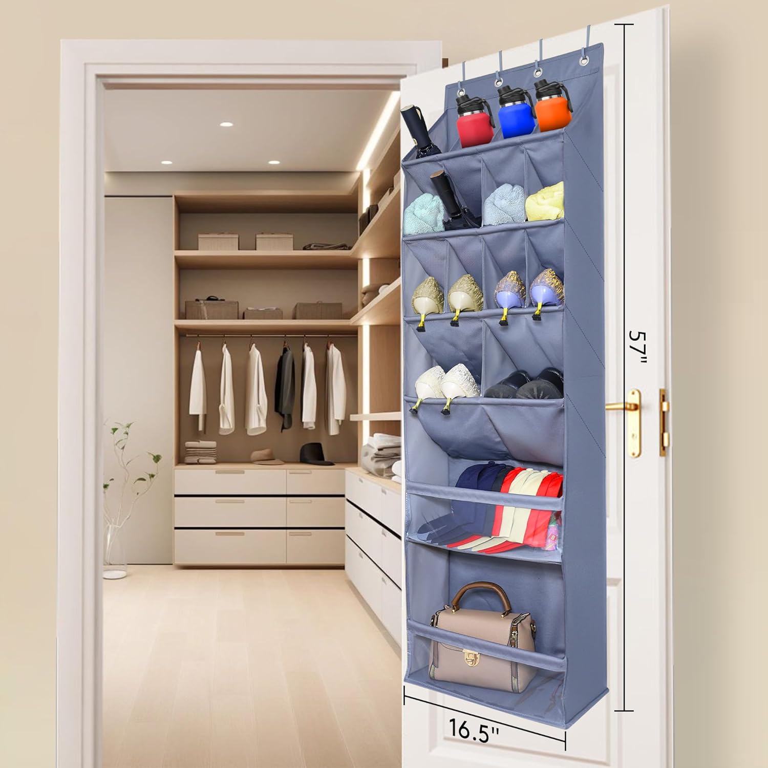 - 4 Sturdy Hooks & Easy to Use: Each door shoe organizer has 4 heavy duty grommets and 4 removeable metal hooks which fit most standard door between 1.35" to 1.57" thick, easy to install on the door and don't need any tools. The 16.5โ wide hanging shoe rack suitable for most door of closets, bathroom, bedroom, baby or kid room, pantry room, laundry room, playroom, college, etc.