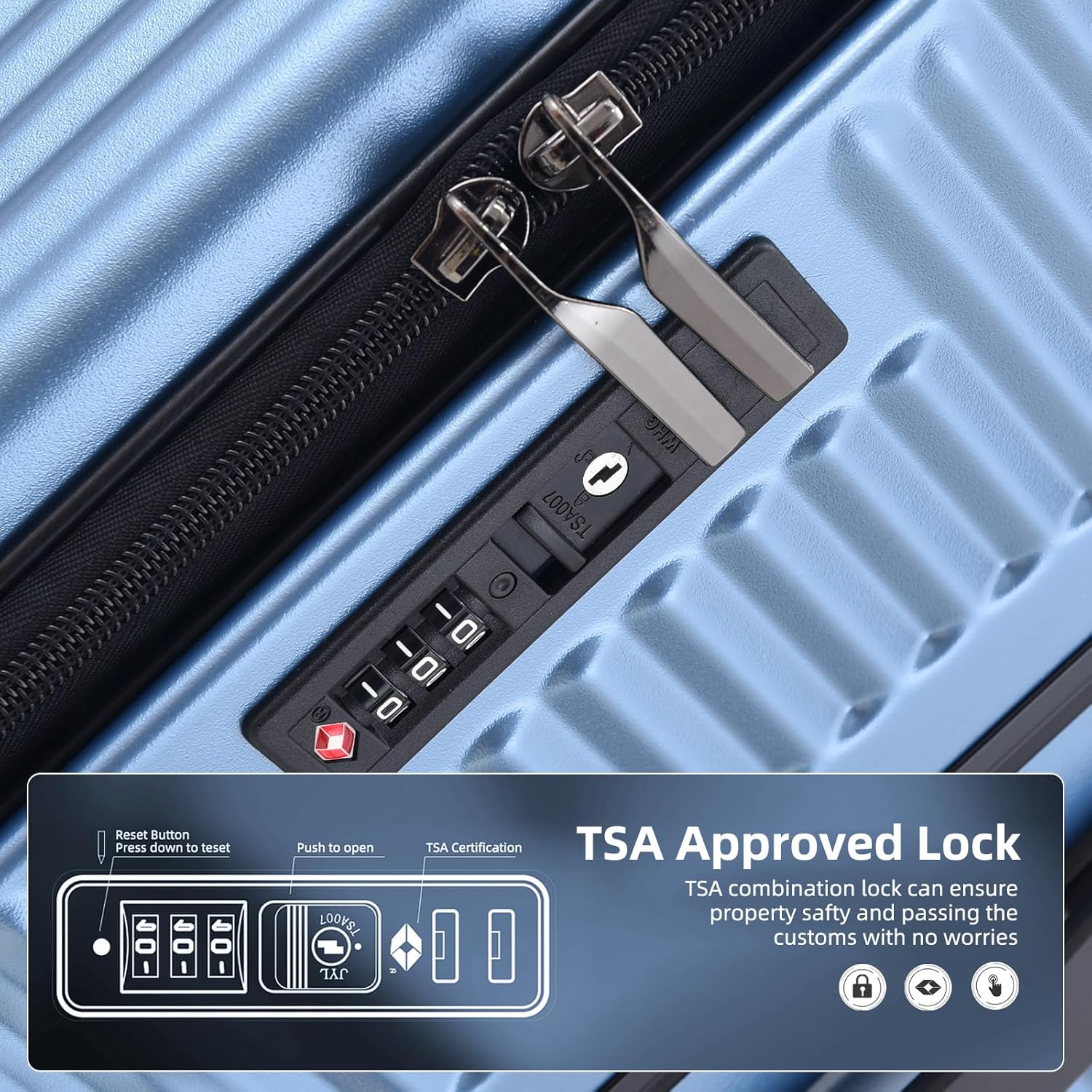 - Explosion-proof Zipper & Side Mounted TSA Lock: The difference between something good and something great is attention to detail. One of the minor details that really matter in every luggage is the zipper, We all know a broken zipper basically means the whole luggage is a waste. That’s why we use the explosion-proof zipper in our suitcase. The side mounted TSA lock is more convienent and easy to open or lock. Tips: No keys in the package and no need keys to open. Original unlock password 0-0-0