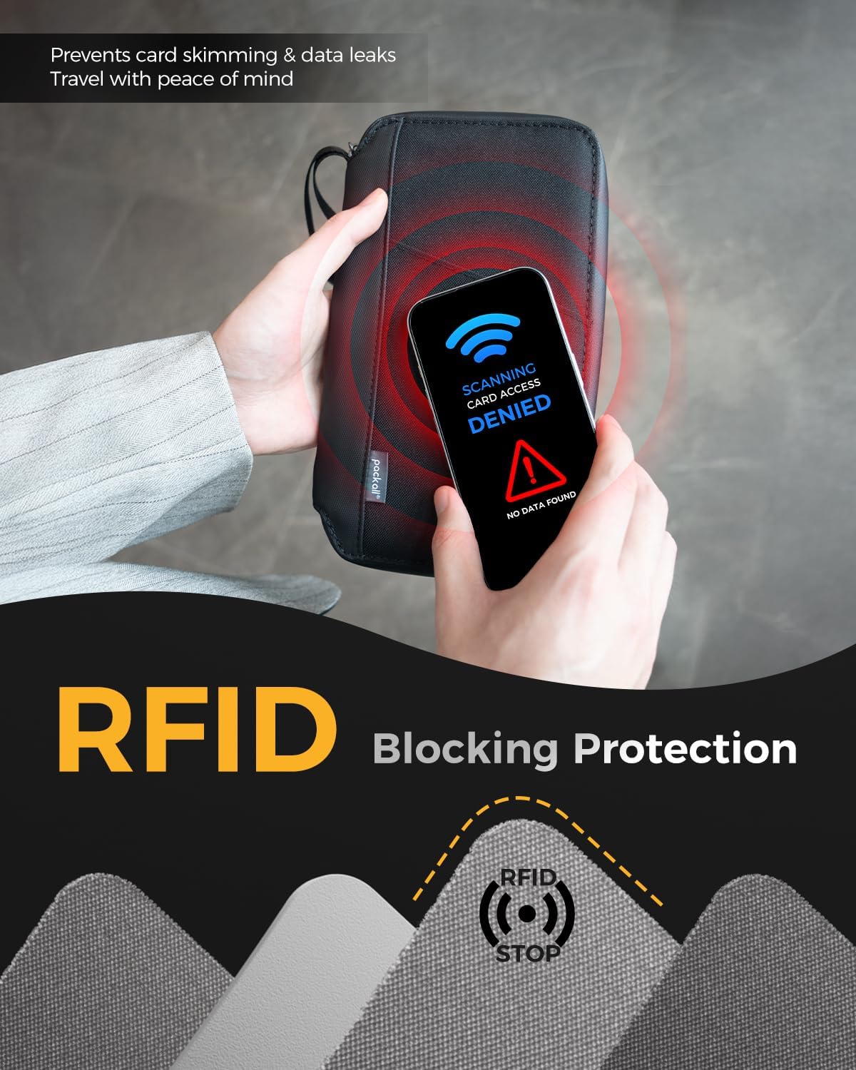 - RFID Blocking: The built-in RFID protection layer effectively safeguards your ID card, driver's license, and credit/debit card from unauthorized scanning and data theft. Travel with confidence, enjoy a worry-free journey