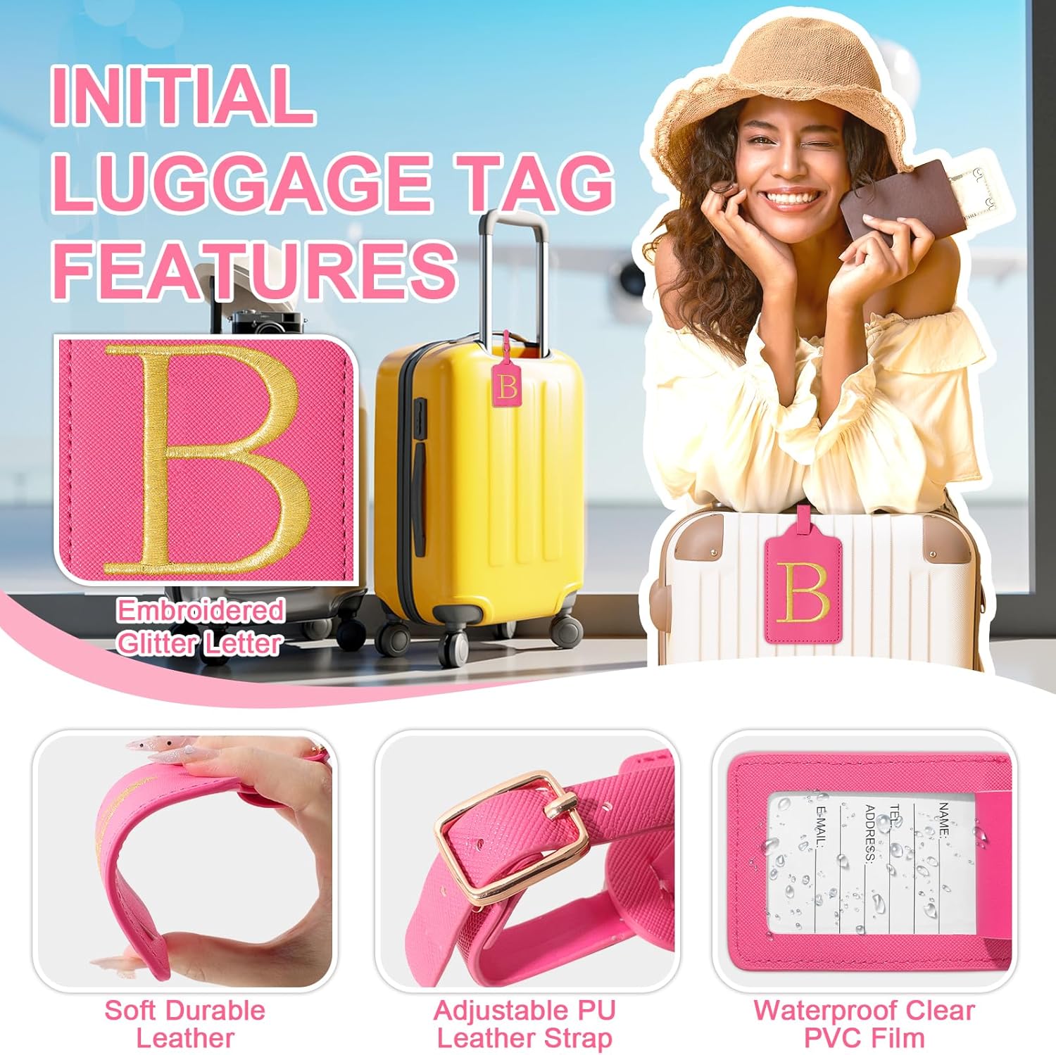 - ✈【Embroidered Initials Luggage Tag】Cute exquisite A-Z personalized luggage tag for suitcases with gold border glitter embroidered letter patch, the letters are made from carefully stitched gold-colored thread.Firmly sewn to the tag, you don't have to worry about them falling off. Bright gold letters and vibrant luggage tag colors to help your suitcases be more easily recognizable at baggage claim.Monogram travel tags make your luggage more personal.