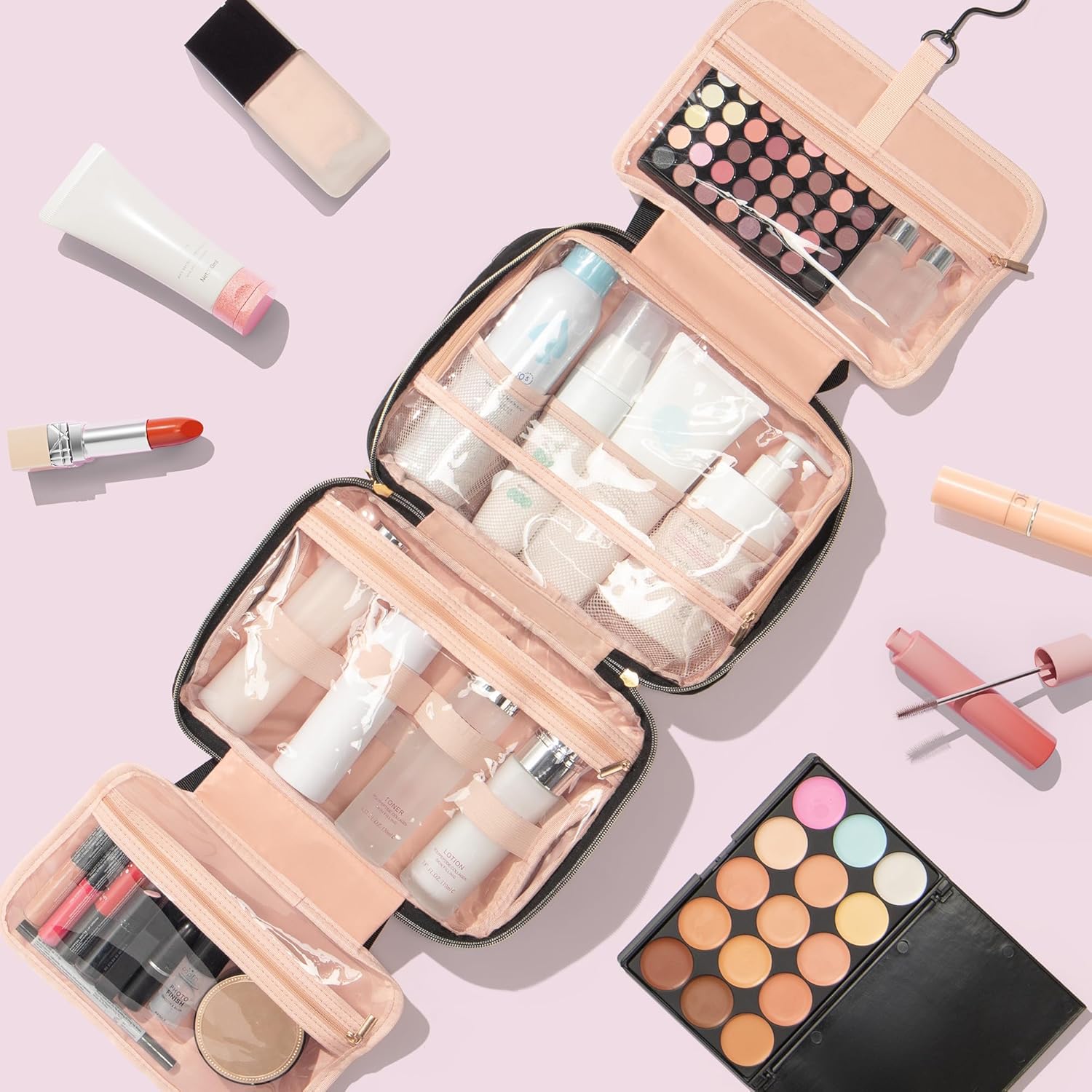 - STURDY HOOK FOR EASY ACCESS: Equipped with a 360°swivel metal hook, you can easily hang this toiletry bags for traveling anywhere, providing versatile hanging options and allowing access all your stuff without needing to unpack or take everything out. With the hanging toiletry bag, all you need to do is hanging it up without cluttering up the bathroom vanity or night table. You can fold the compartments and close it into a compact travel bag. Perfect for business trips, travel, cruise ship etc