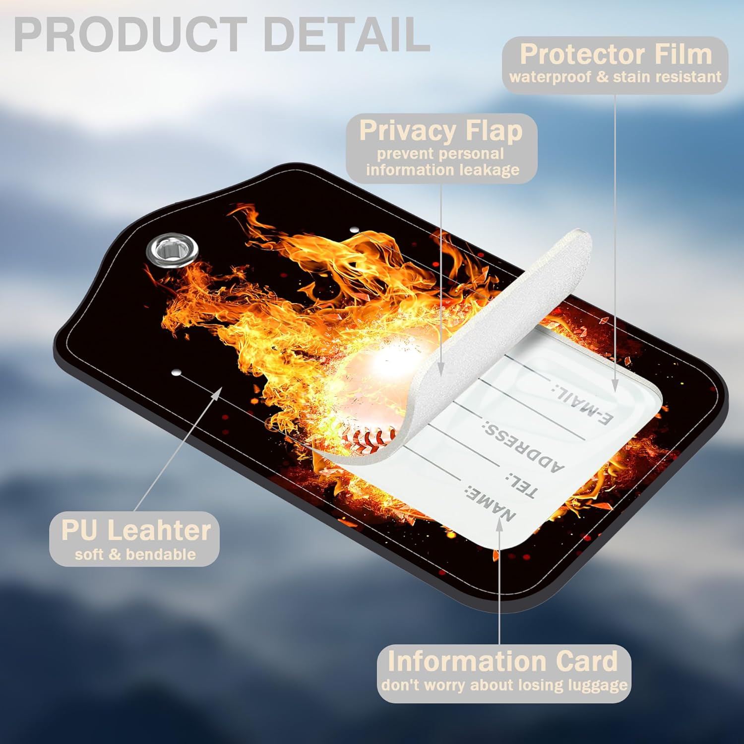 2 Pcs Baseball on Fire Luggage Tags for Suitcases PU Leather Baggage Tags Name ID Label with Privacy Cover and Stainless Steel Loop for Men Women Travel Bag Suitcase