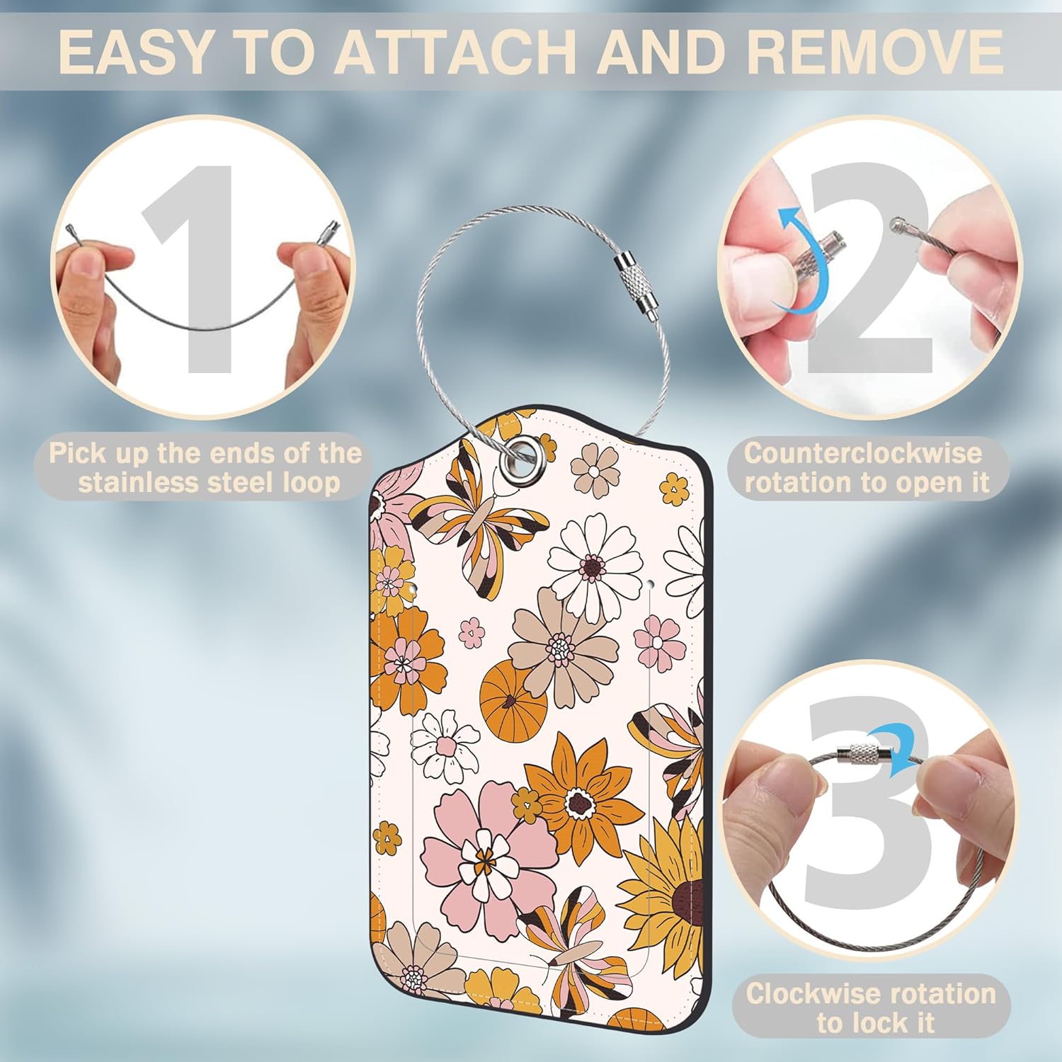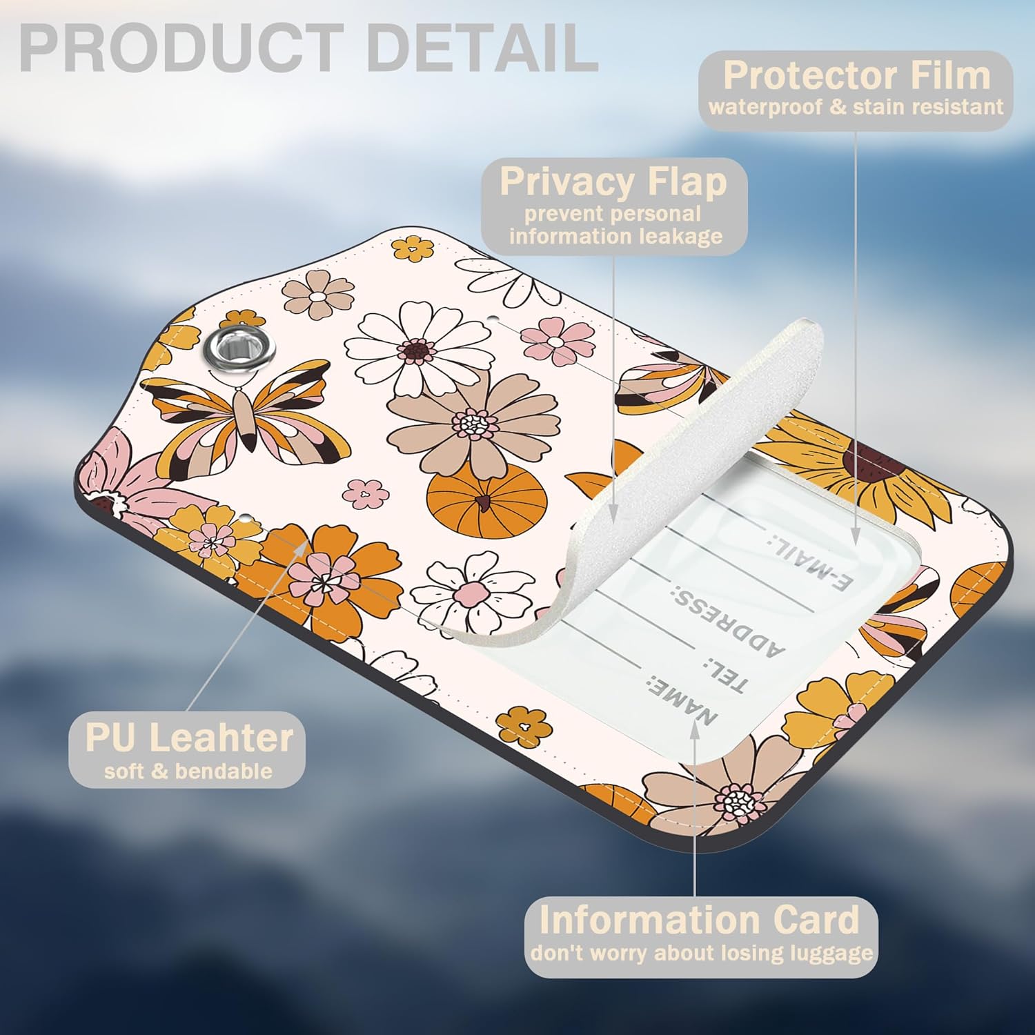 2 Pack Luggage Tags for Suitcases Retro Groovy Flowers and Butterfly Leather Luggage Tags Privacy Cover ID Label with Stainless Steel Loop and Address Card for Women Men Travel Bag Backpack