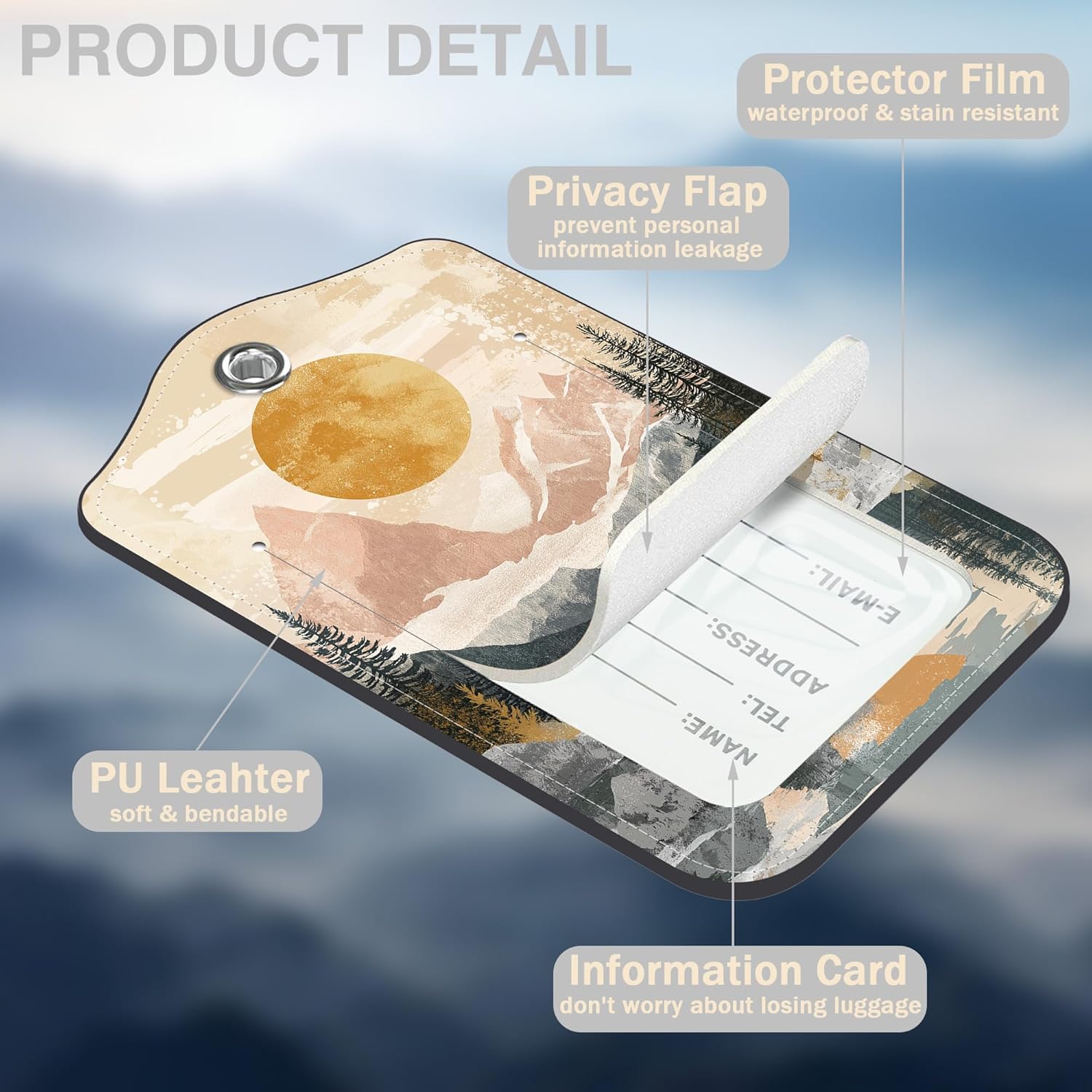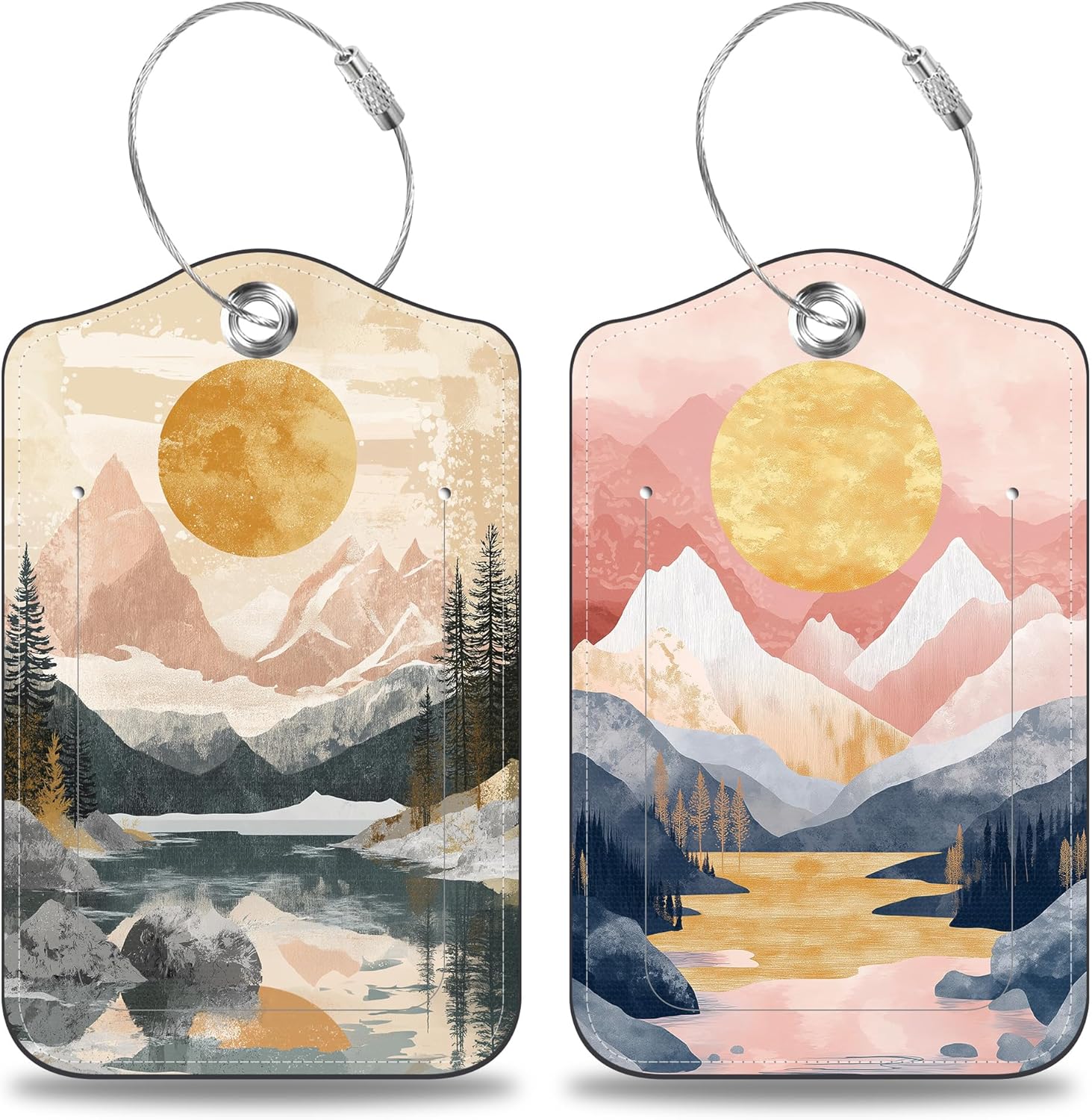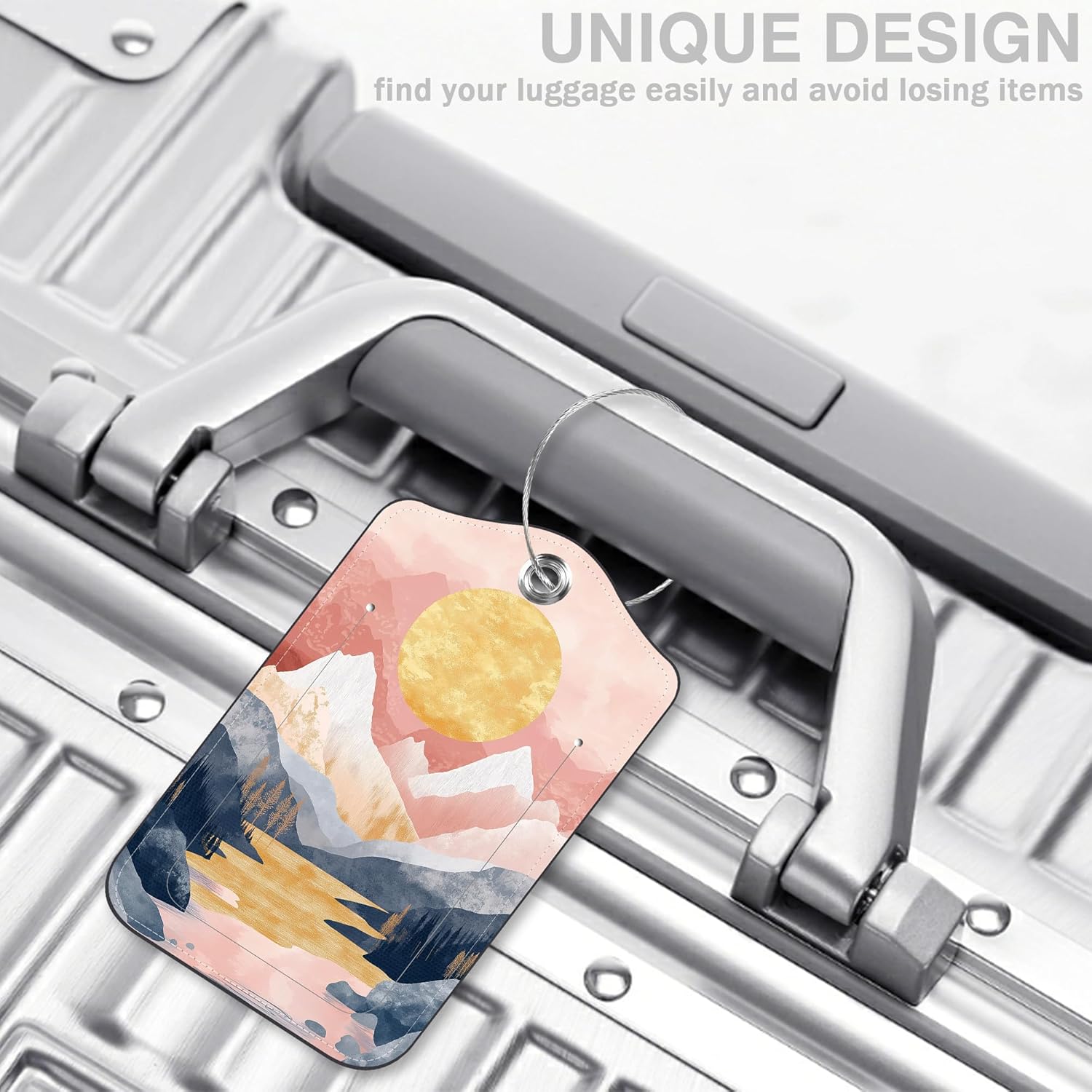 2 Pack Luggage Tags for Suitcases Abstract Pink Mountain Sun Landscape Leather Luggage Tags Privacy Cover ID Label with Stainless Steel Loop and Address Card for Women Men Travel Bag Backpack