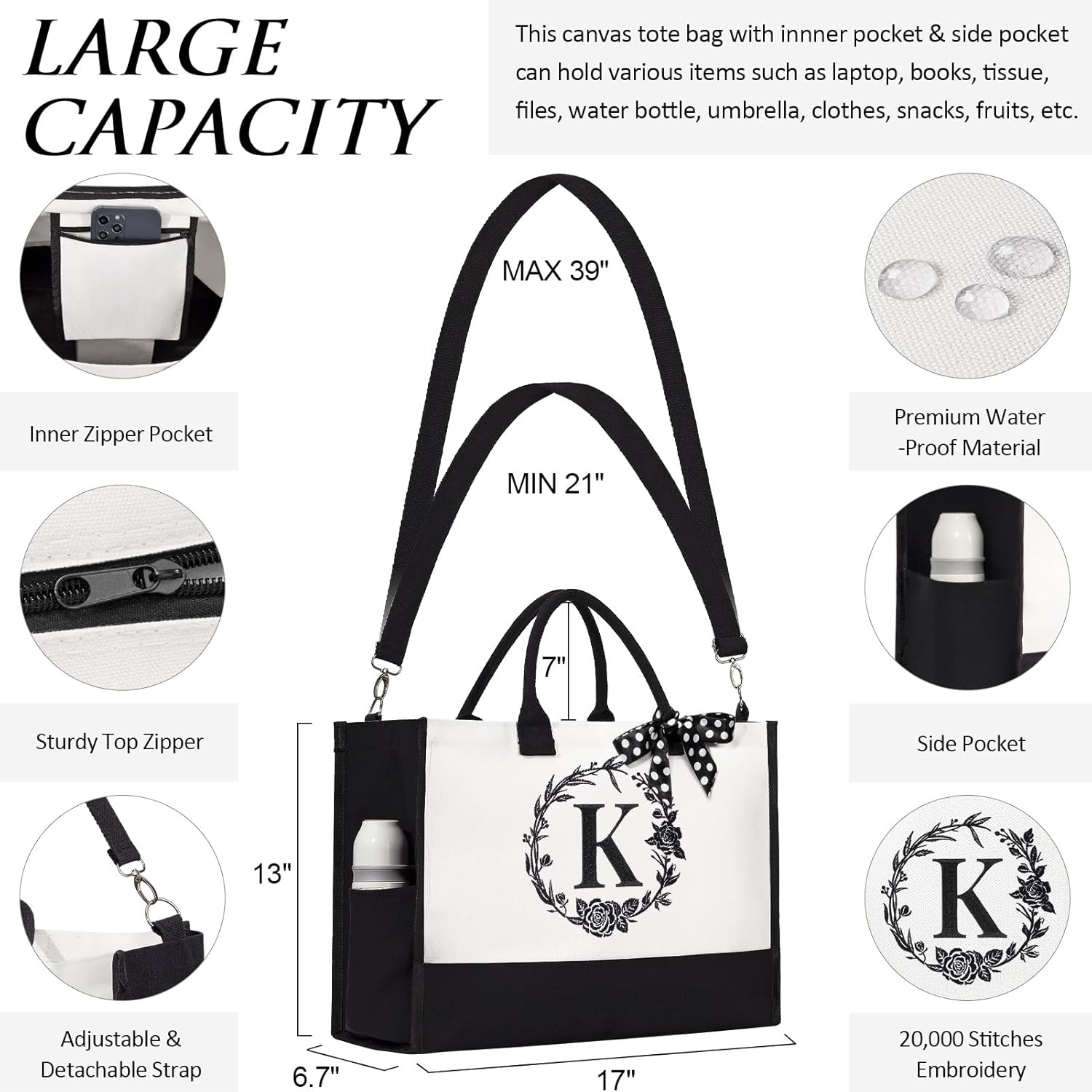 - PORTABLE & MULTIFUNCTIONAL TOTE BAG: This canvas tote bag for women includes a detachable shoulder strap (21"-39") and can be used as a crossbody, shoulder, or handbag. The large tote bags for women has an inside zip pocket for keys, phone, cash etc. and side pocket for a water bottle, umbrella or magazine. This monogrammed tote bags for women in classic black and white complements any outfit for various occasions. Perfect for weekend trips, work, shopping, travel, beaches, picnics and more