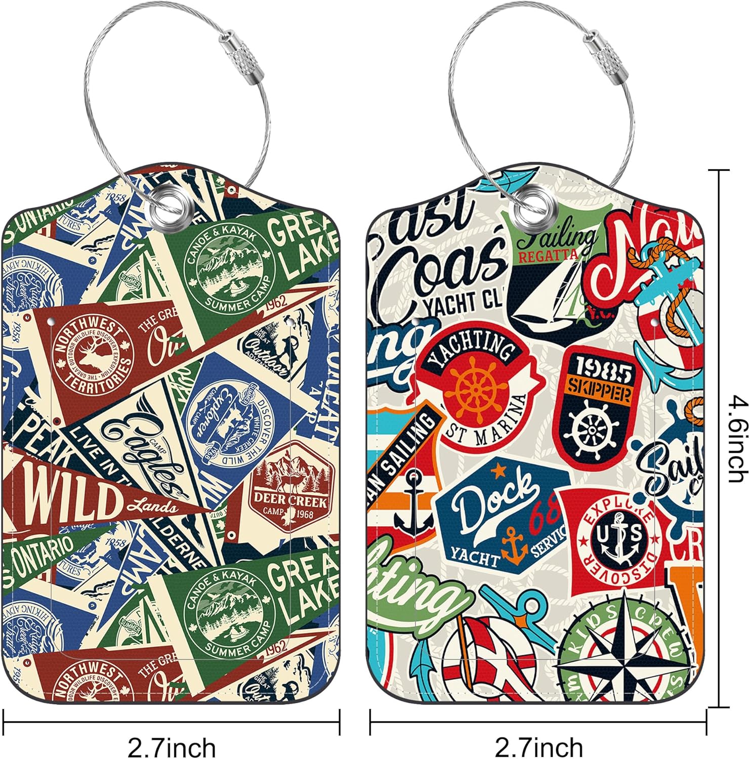 2 Pack Luggage Tag for Suitcase Nautical Patches Mountain Lake Camp Flag Leather Suitcase Tags with Privacy Name ID Label and Stainless Steel Loop for Travel Bag