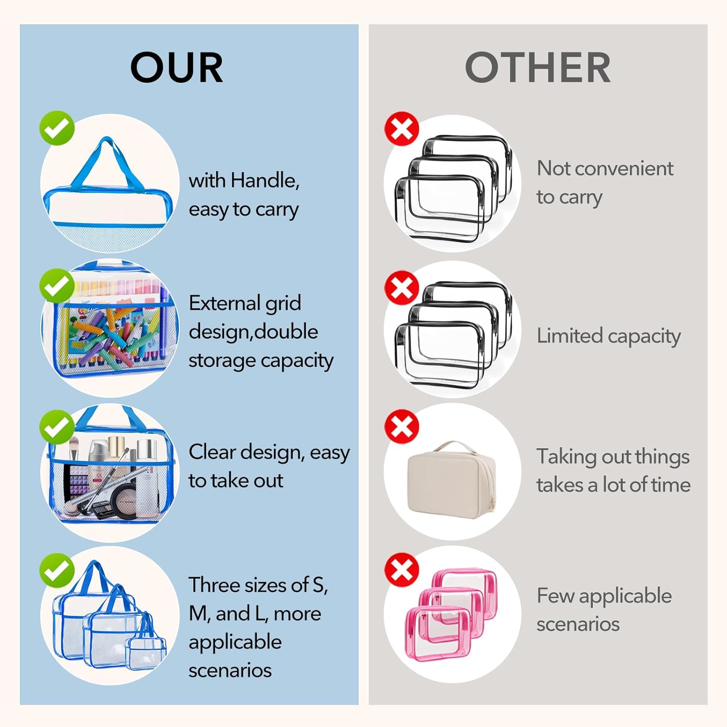 - 【Clear & TSA Approved for Travel】XEWEA 3 Pack Clear Toiletry Bags are following TSA 3-1-1 rules.and in order to meet the needs of different occasions, we have designed 3 sizes—Large (12 x 9.4 x 3.5 in), Medium (9.8 x 8.3 x 2.8 in), and Small (7.5 x 5.9 x 2.4 in). ❀Therefore, please check the sizes before purchasing to avoid inconvenience. Thanks!❀