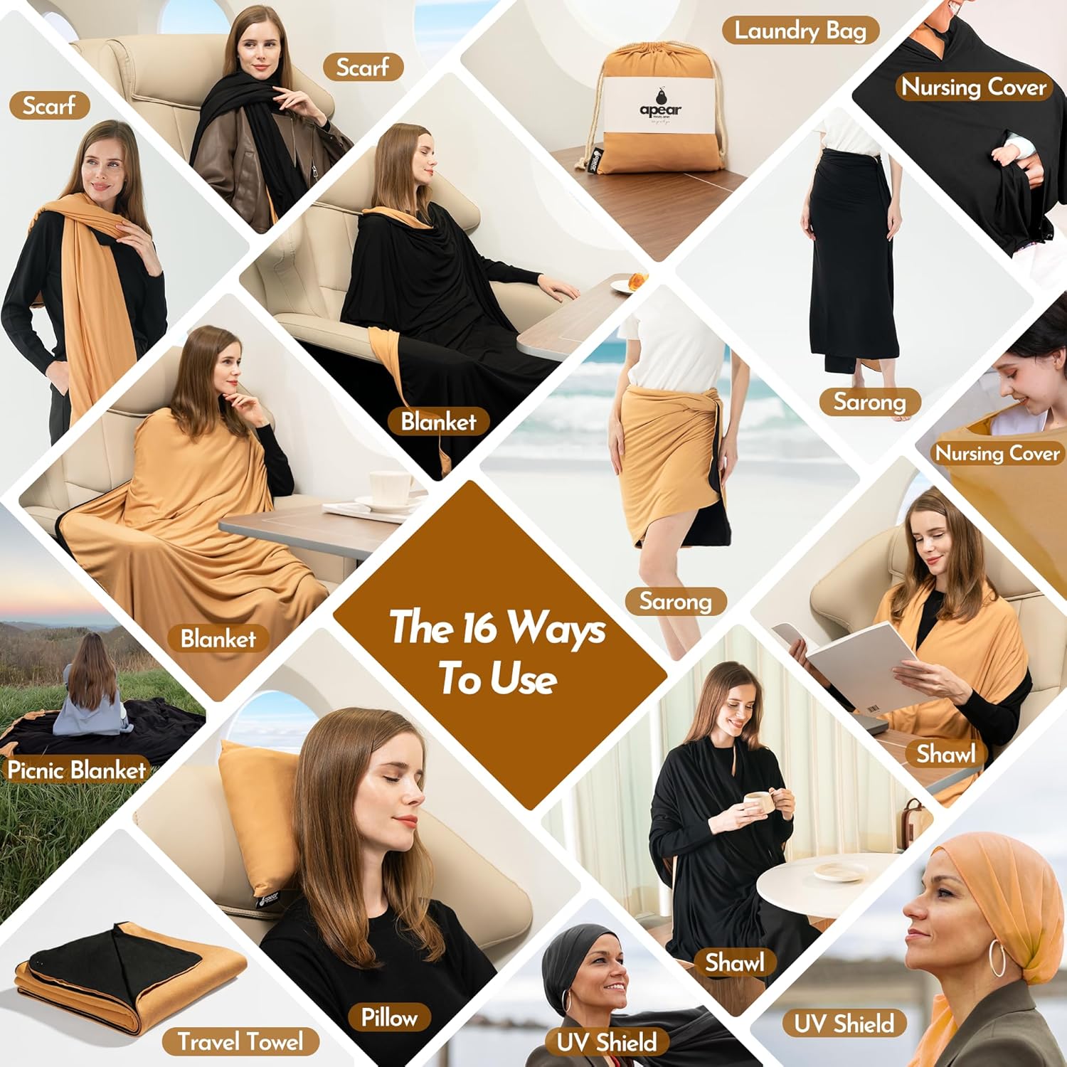 - 16-in-1 Versatile Travel Blanket: Use this compact blanket with bag as a reversible scarf, shawl, sarong, picnic blanket, nursing cover, pillow, or even cape. With a hidden zipper pocket to secure valuables, it's a must-have airplane travel essential for long flights.