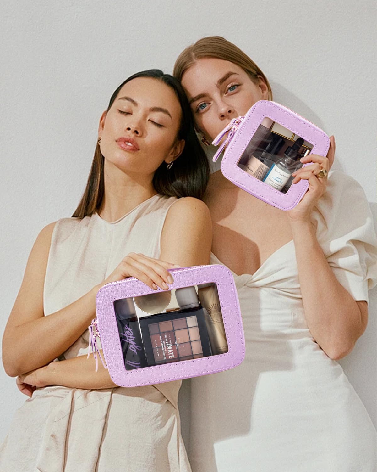 - Clear Design: Our 2Pcs Travel Makeup Bag is elegant ,and stylish, this makeup travel organizer was designed in a minimalist boxy shape,is sleek and minimalistic look for your makeup accessories collection. And is designed with a transparent PVC window,all items are clear at a glance, and you can quickly choose the cosmetics you need.Portable and lightweight Slip it into your purse, backpack, everyday tote or travelling bag for easy access to your must-have items. Large Size:8.1'' x 6.1'' x2.5'', Mini Size:5.1'' x 4.8''x 2''.