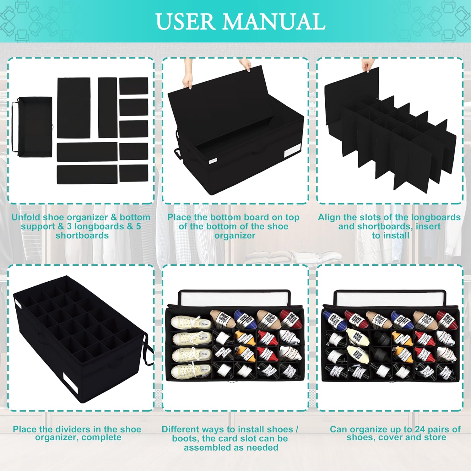 - Ideal Shoe Storage Solution: Shoe racks are nice, but they neither fit so many pairs of shoes nor Dust-proof. This closet shoe bin CHANGES the way for shoe organizers and storage, it won't take up much space but can easily store up to 24 pairs of shoes.