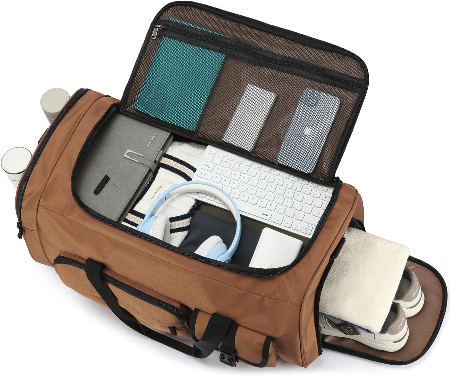 - 【Multifunctional Pockets & Design】Our duffle bag backpack has a total of 11 pockets. Includes 1 large internal mesh pocket and 2 internal zipper pockets; Outside: 2 front zip pockets, 1 flap pocket, 1 side zip pocket and 2 mesh water bottle pockets, 1 shoes compartment, 1 trolley luggage sleeve. The bottom zip pocket hides the backpack straps when not in use. And the elastic cord on top provides additional storage space for jackets or towels.