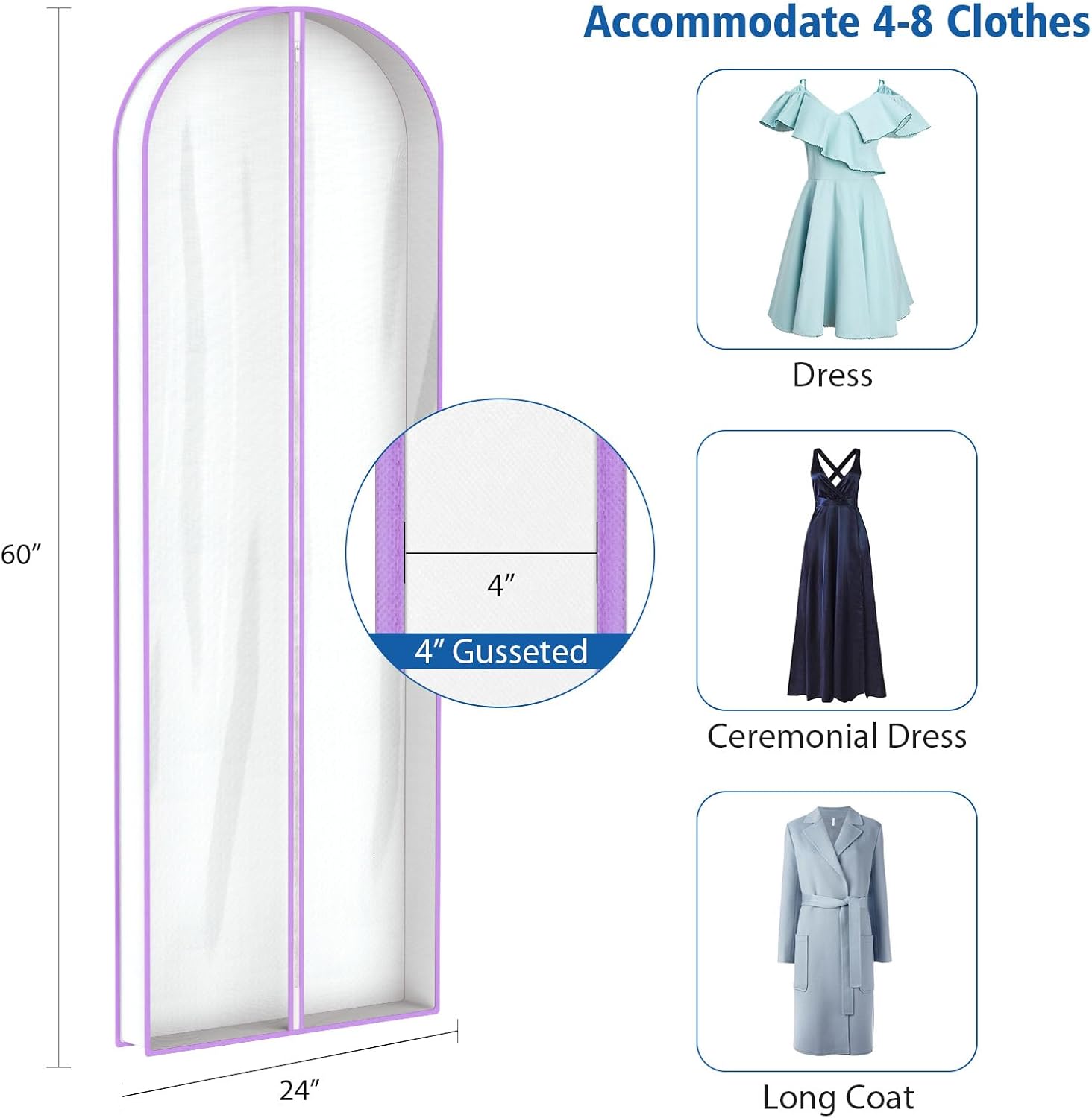 - 【Upgraded Large Capacity】 The garment bag for dresses long with an impressive size of 72" x 4" x 24" (LxWxT), with upgrade extra 3" gussets, clothes storage bag offer ample space and increased storage capacity. Store up to 8 pack dress, 5 pack Trench coat, 3 pack down coat, and dresses with ease. Extra-Wide garment bags, the ultimate solution for storing and protecting your clothing collection.