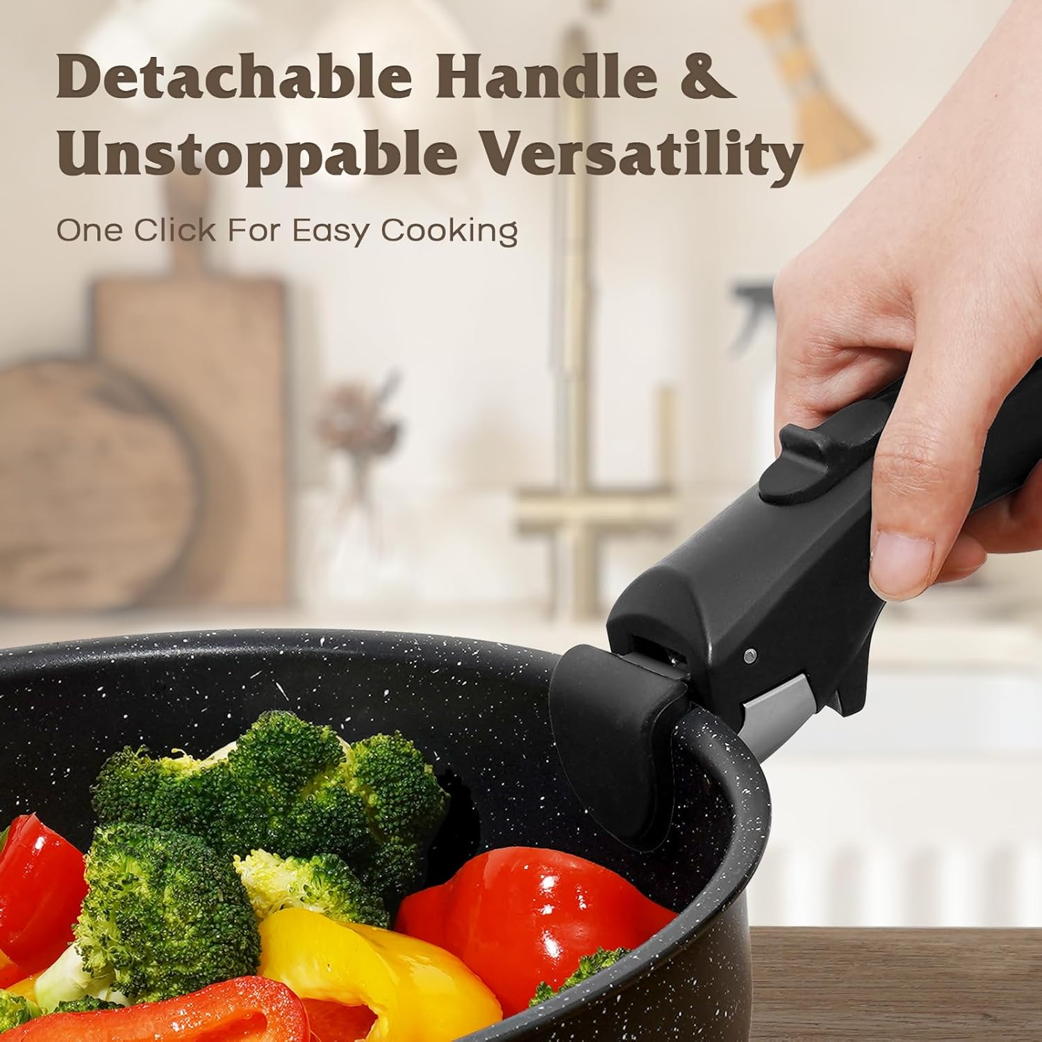 - Efficient Storage: Pots and pans set with detachable handles allow for compact nesting, optimizing 75% kitchen cabinet space and providing a healthy cooking environment,making for easy storage in cabinets or RVs