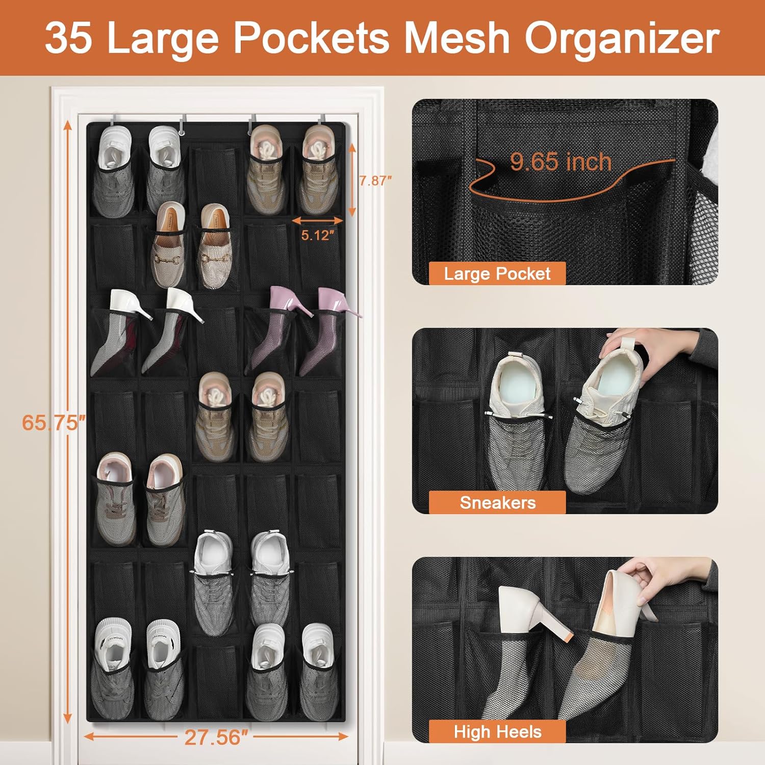 - Stay Organized & Clutter-Free: This over-the-door shoe organizer features 35 mesh pockets, holding up to 17 pairs. It keeps shoes neatly stored and protected while saving space. The breathable mesh pockets provide clear visibility for easy access, reducing time spent searching. Perfect for sneakers, slippers, sandals, kids' shoes, and seasonal footwear.