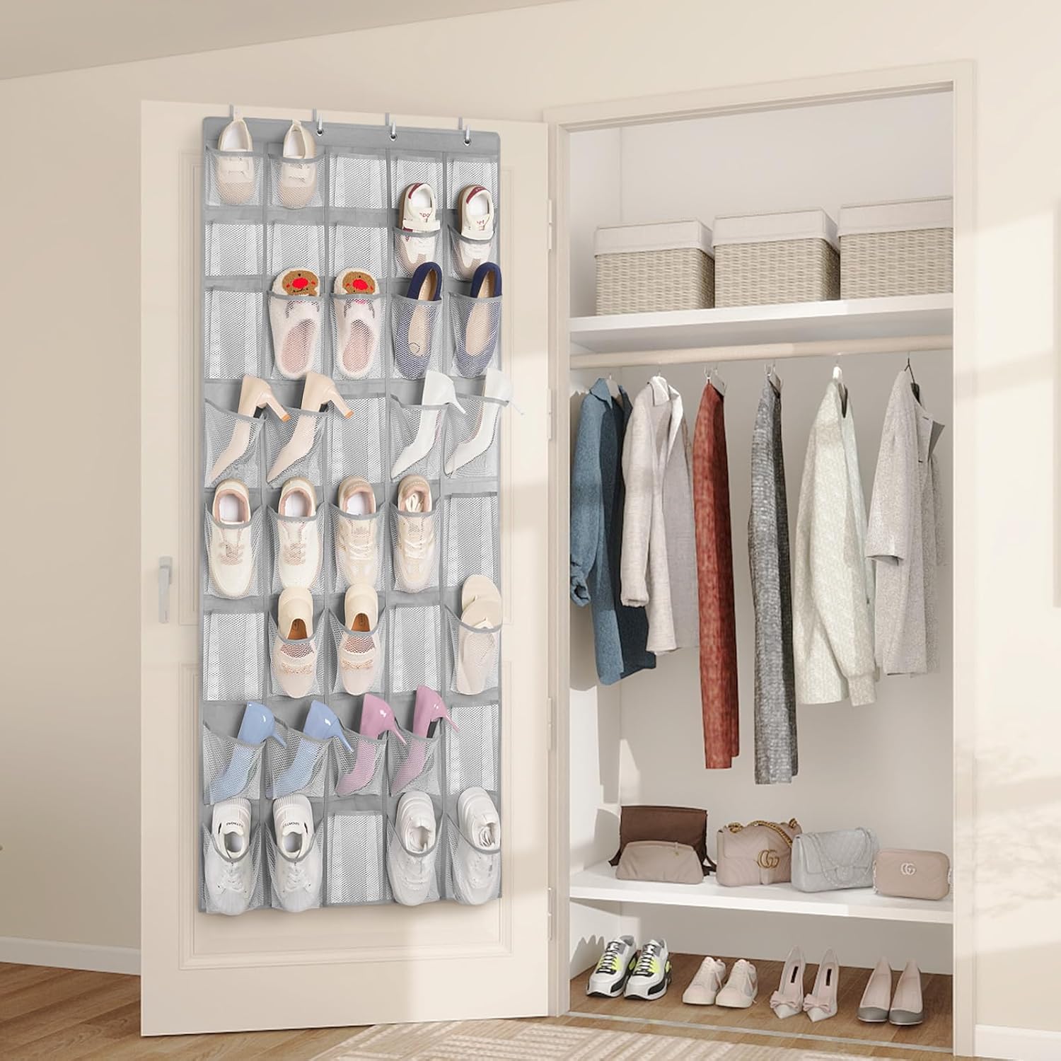 - Save Space & Maximize Storage: Our door shoe organizer takes advantage of unused vertical space, freeing up floors and wallsâideal for entryways, closets, bedrooms, apartments, or dorms. Hanging shoe organizer maximizes storage capacity, allowing you to store more shoes in tight spaces while keeping your home neat and clutter-free!