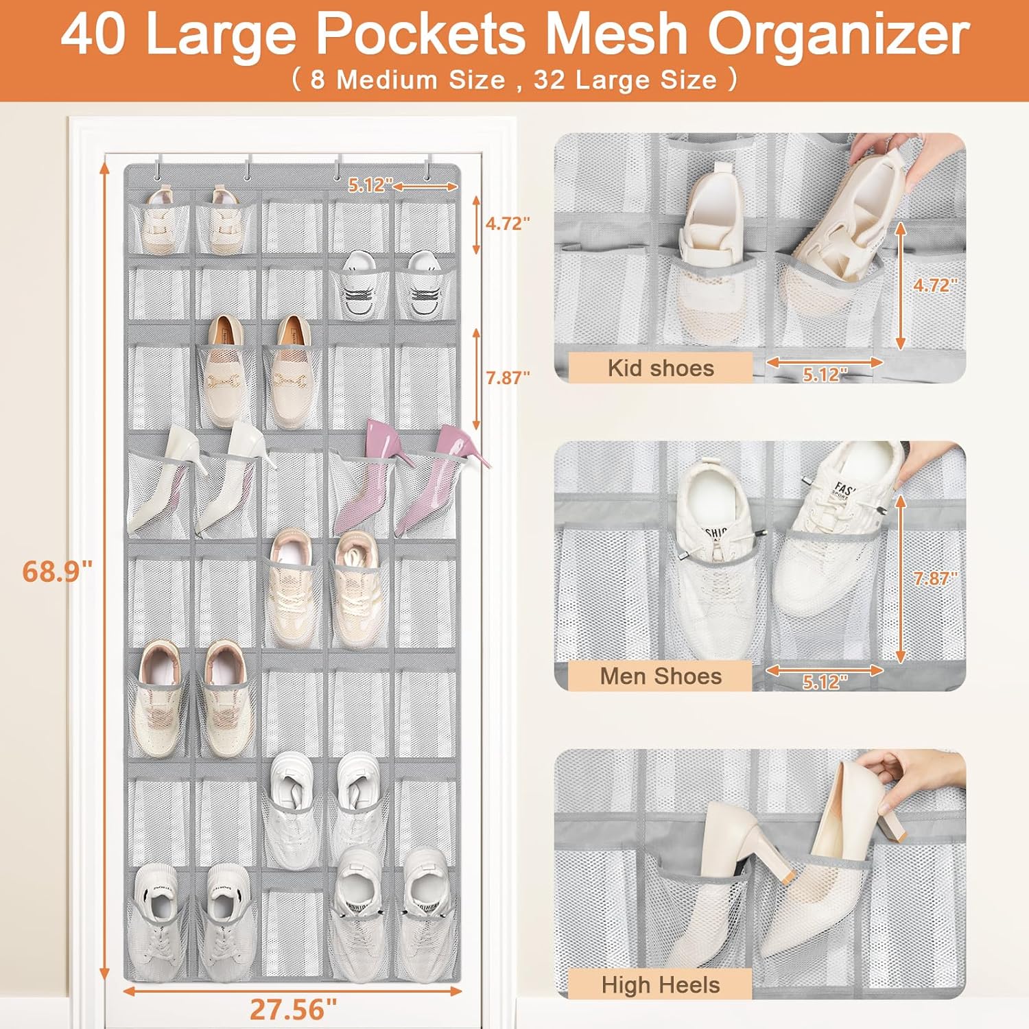 FENTEC 40 Large Pockets Over The Door Shoe Organizer, Mesh Hanging Shoe Organizer Shoe Rack for Closet Mesh Closet Shoe Holder, Over Door Organizer, Shoe Organizer for Wall, Grey, 1 Pack