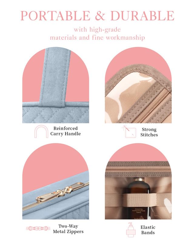 - USER-FRIENDLY DESIGNS: Designed with user convenience in mind, this travel bag for toiletries incorporates supporting pads to maintain its shape and provide excellent protection for the items inside. Elastic straps keep toiletry bottles upright, preventing liquids from escaping and causing a mess. The reinforced zippers enhance durability and ensure smooth opening, adding to the overall user-friendly experience.