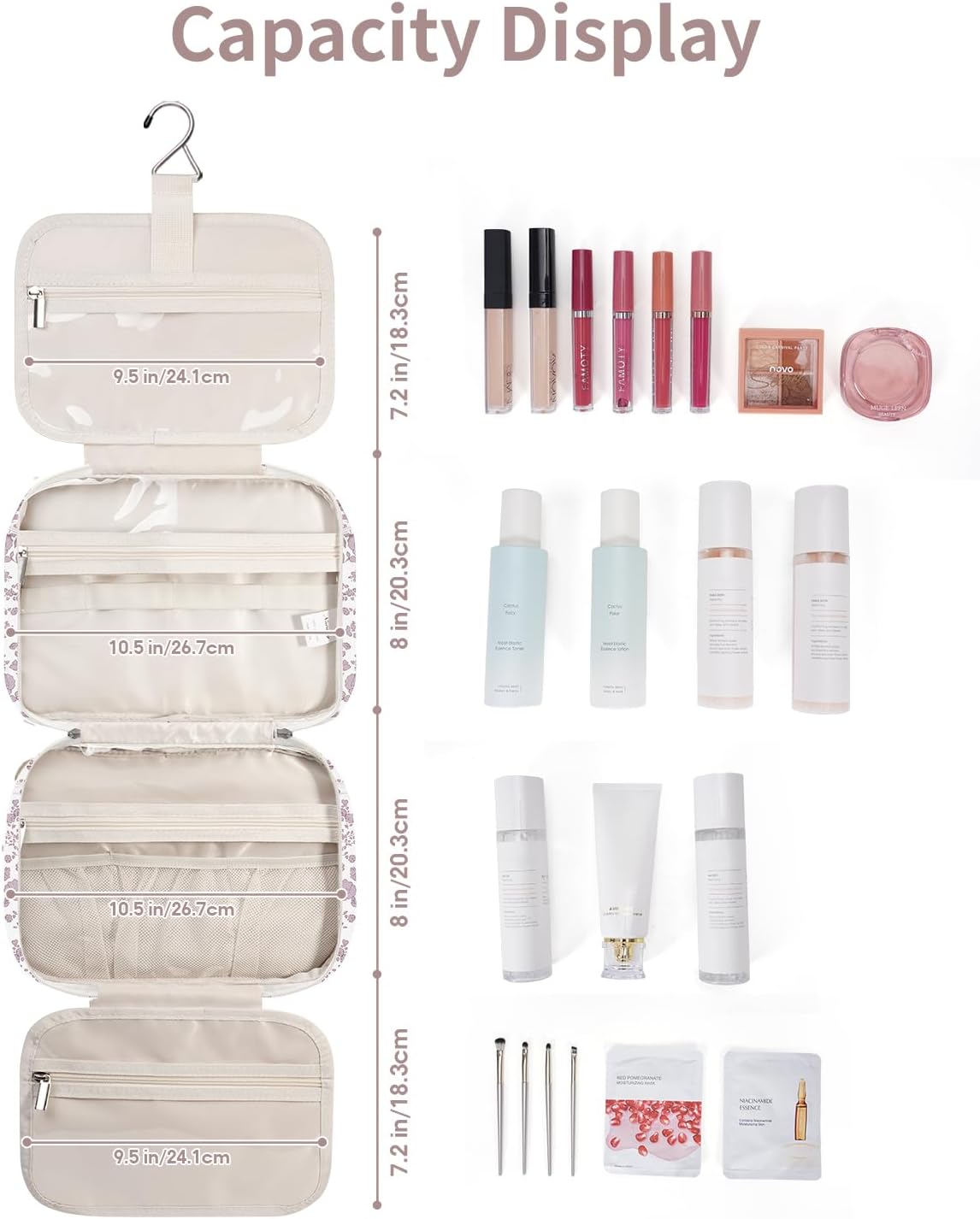 - NOT BULKY DESIGN - Large Capacity yet compact design, weighing 14 ounces. large metal hook allows hanging the toiletry case from towel rack, coat hook or whereever is available, making your toiletries and cosmetics displayed well for easy access