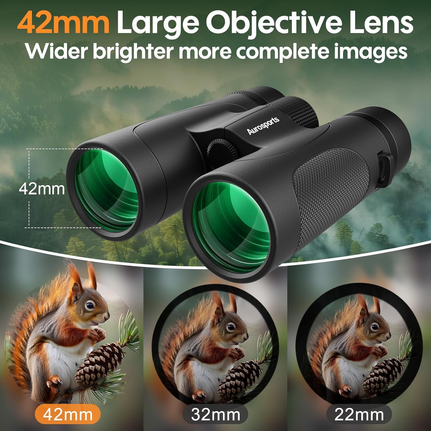 - 12X HIGH POWERED BINOCULAR:Aurosports 12X42 binoculars for adults high powered with Fully FMC Multi-coated lenses and 20mm BAK4 HD dielectric-coated prisms, the Hunting binoculars provide supper brightness, clarity, and sharpness, provide a new level of hunting even in overcast, dusk environment.