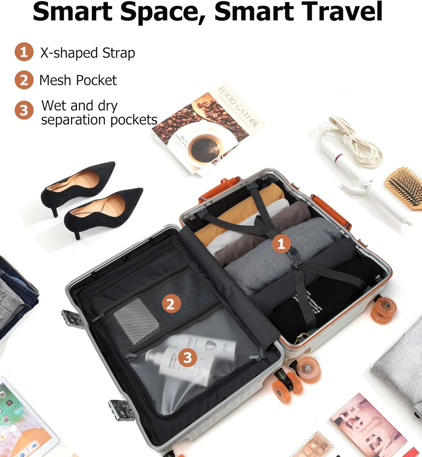 - Multi-Functional and Stylish Aluminum Suitcase: This suitcase is designed for convenience and practicality. It features a built-in cup holder, allowing you to keep your drink easily accessible while on the go. The aluminum alloy corner guards enhance durability, protecting your suitcase from wear and tear. Additionally, the side hook provides a handy spot for hanging bags or accessories, ensuring you stay organized during your travels.
