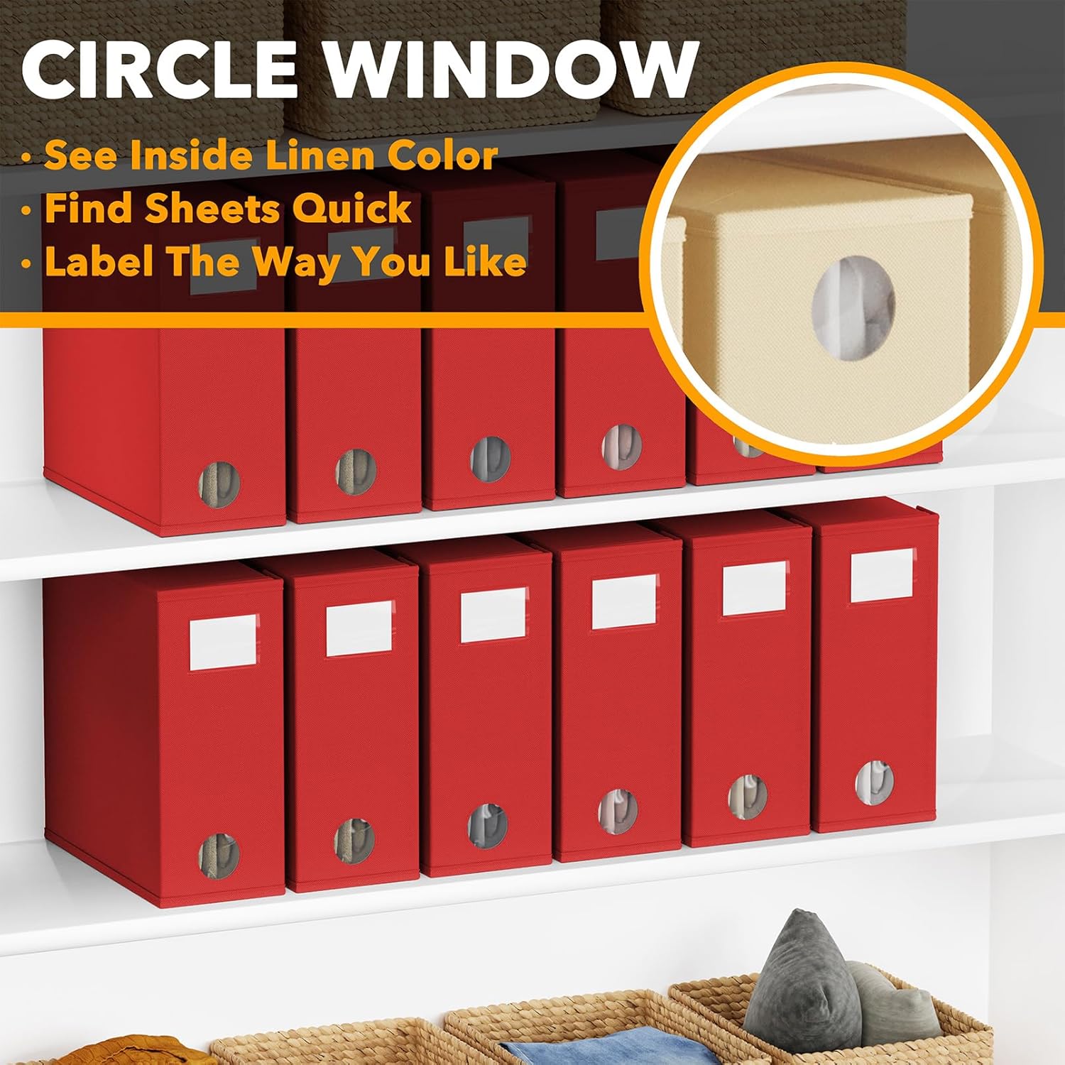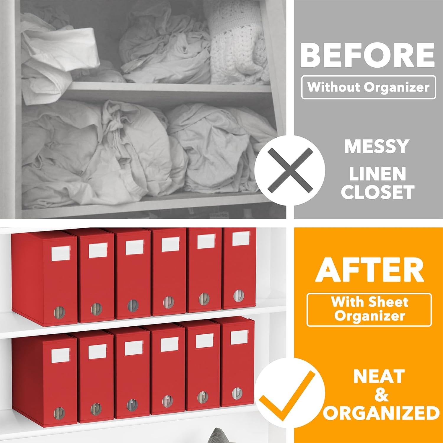 - RED SHEET ORGANIZERS 12 PACK - Make your linen closet organized and beautiful with this foldable bed sheet fabric organizer; Each Storage Organizer SIZE: 5"W x 15"D x 12.8"H