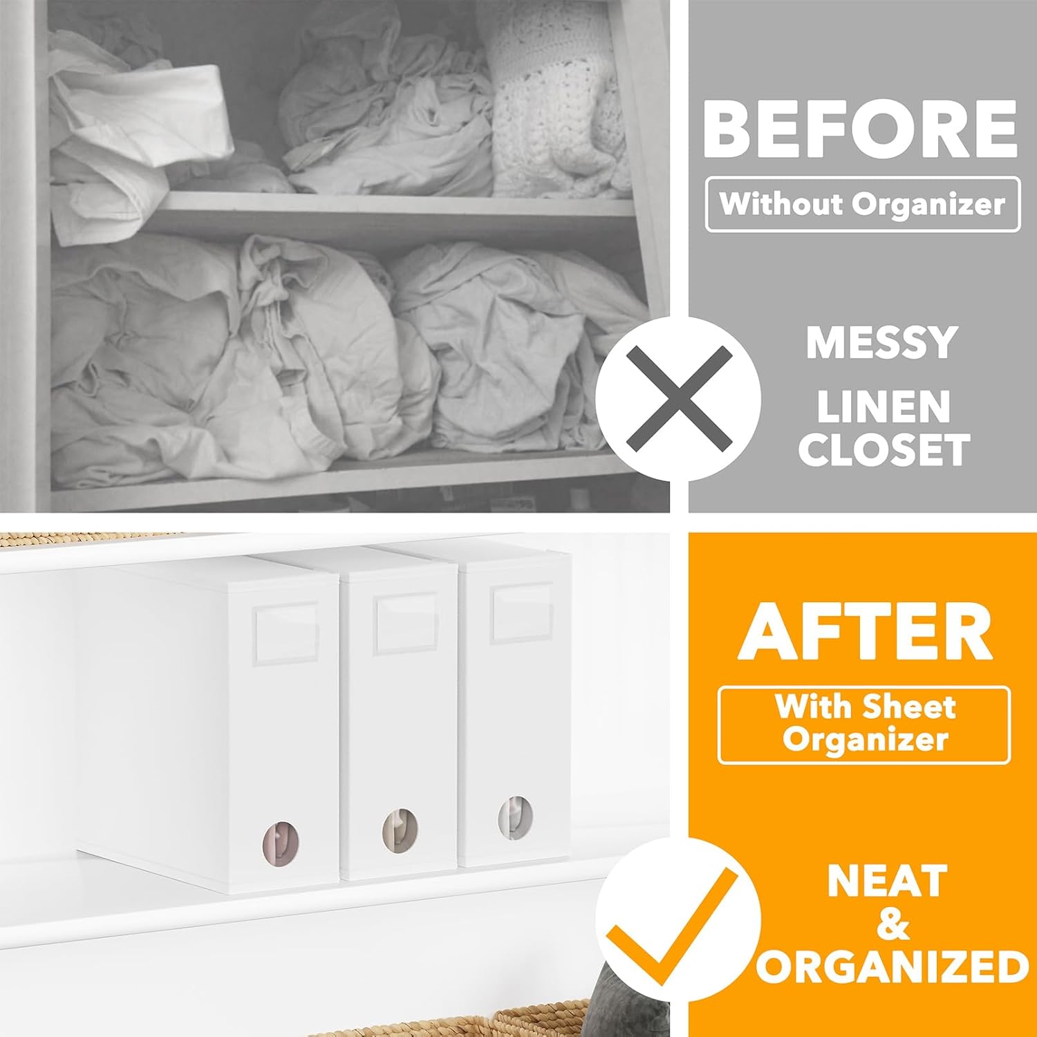 - WHITE SHEET ORGANIZERS 3 PACK - Make your linen closet organized and beautiful with this foldable bed sheet fabric organizer; Each Storage Organizer SIZE: 5"W x 15"D x 12.8"H