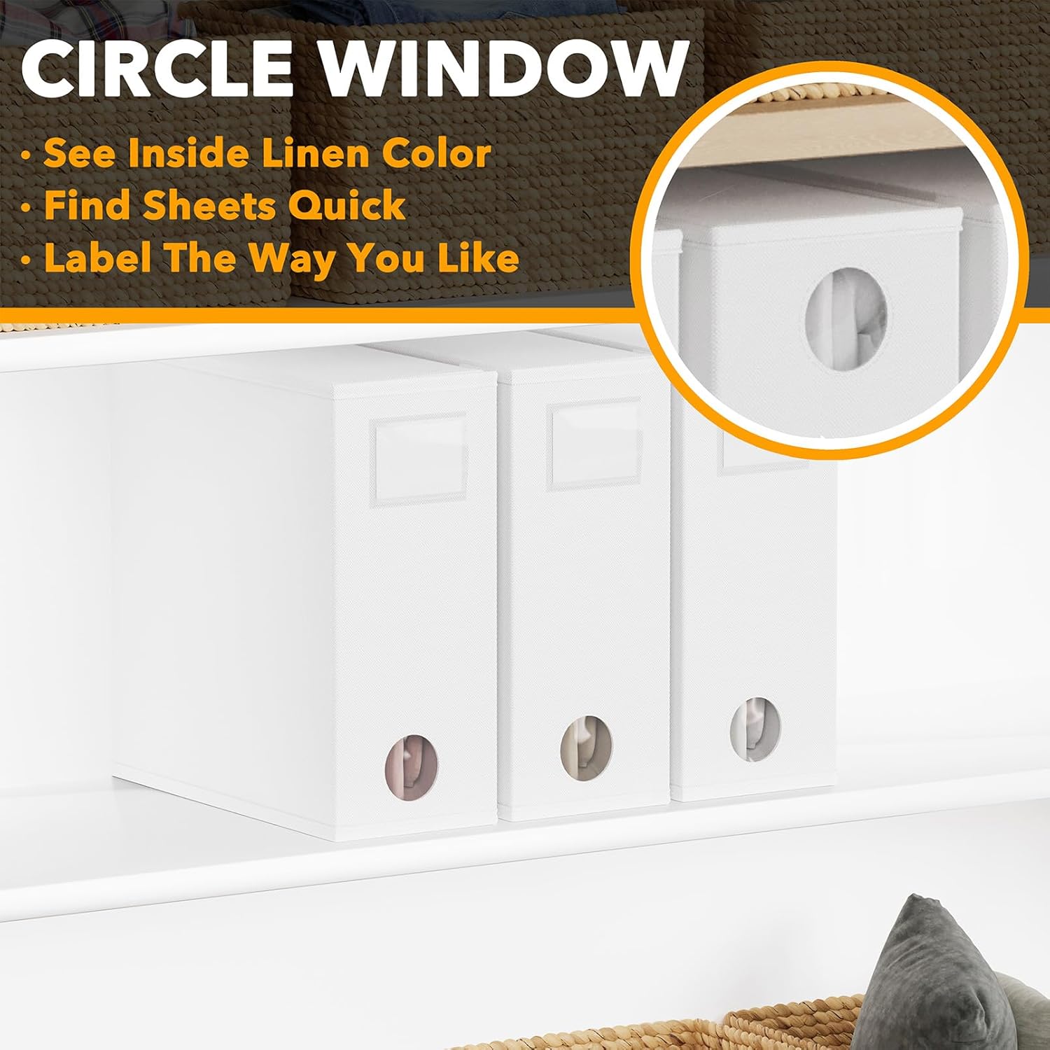 - CIRCLE WINDOW DESIGN - You can see the linen color clearly through the front circle window; This sheets organizer container is beautiful and modern that will fit any home style
