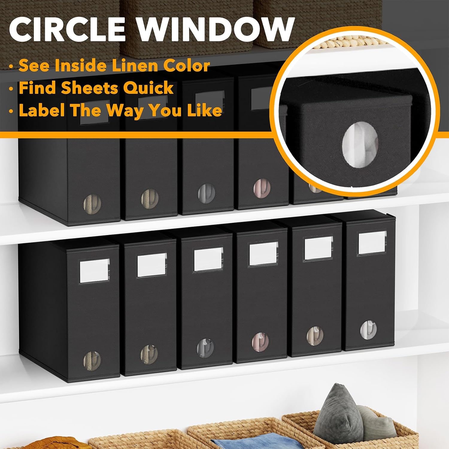 - CIRCLE WINDOW DESIGN - You can see the linen color clearly through the front circle window; This sheets organizer container is beautiful and modern that will fit any home style
