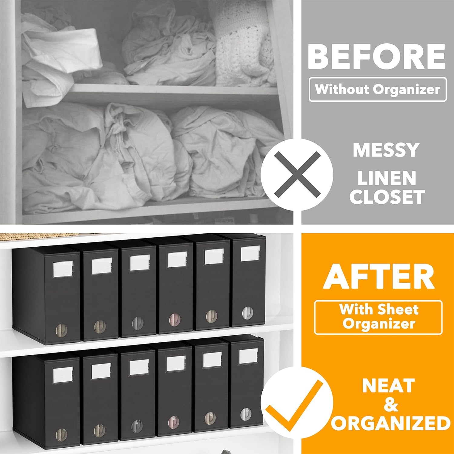 - BLACK SHEET ORGANIZERS 12 PACK - Make your linen closet organized and beautiful with this foldable bed sheet fabric organizer; Each Storage Organizer SIZE: 5"W x 15"D x 12.8"H