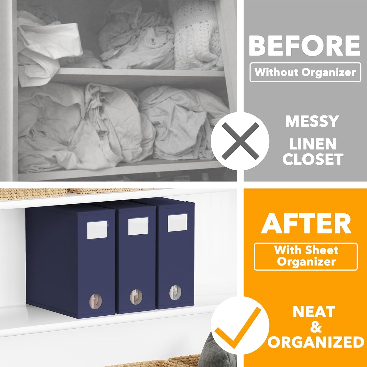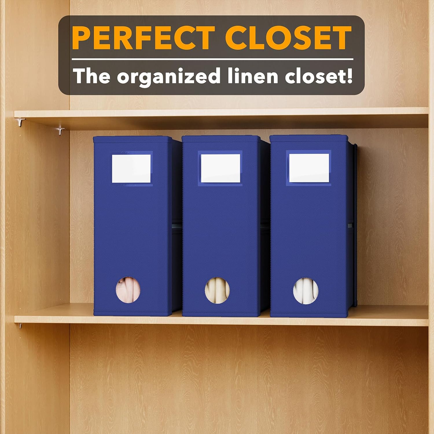 - NAVY BLUE SHEET ORGANIZERS 3 PACK - Make your linen closet organized and beautiful with this foldable bed sheet fabric organizer; Each Storage Organizer SIZE: 5"W x 15"D x 12.8"H