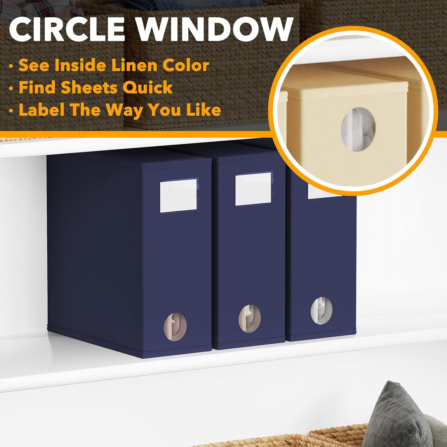 - CIRCLE WINDOW DESIGN - You can see the linen color clearly through the front circle window; This sheets organizer container is beautiful and modern that will fit any home style
