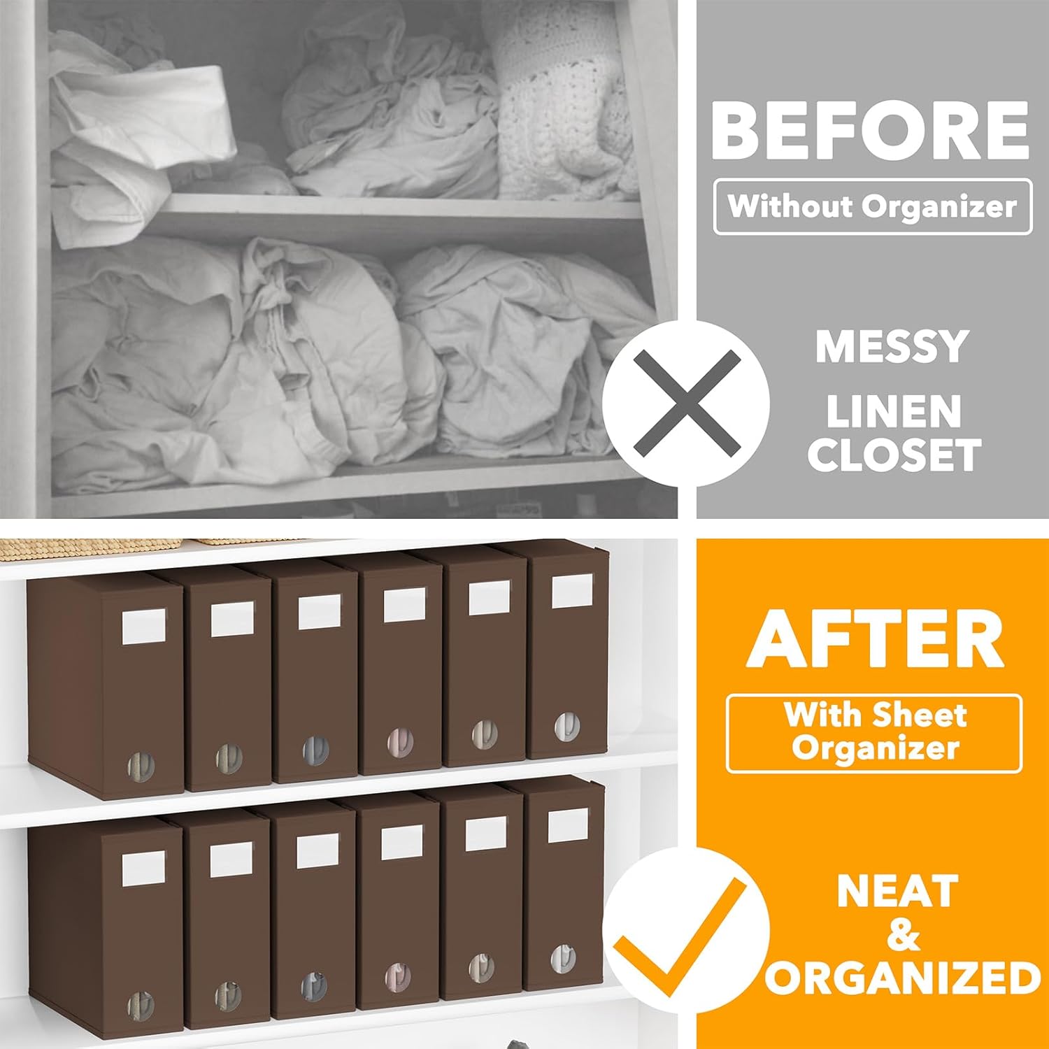- BROWN SHEET ORGANIZERS 12 PACK - Make your linen closet organized and beautiful with this foldable bed sheet fabric organizer; Each Storage Organizer SIZE: 5"W x 15"D x 12.8"H