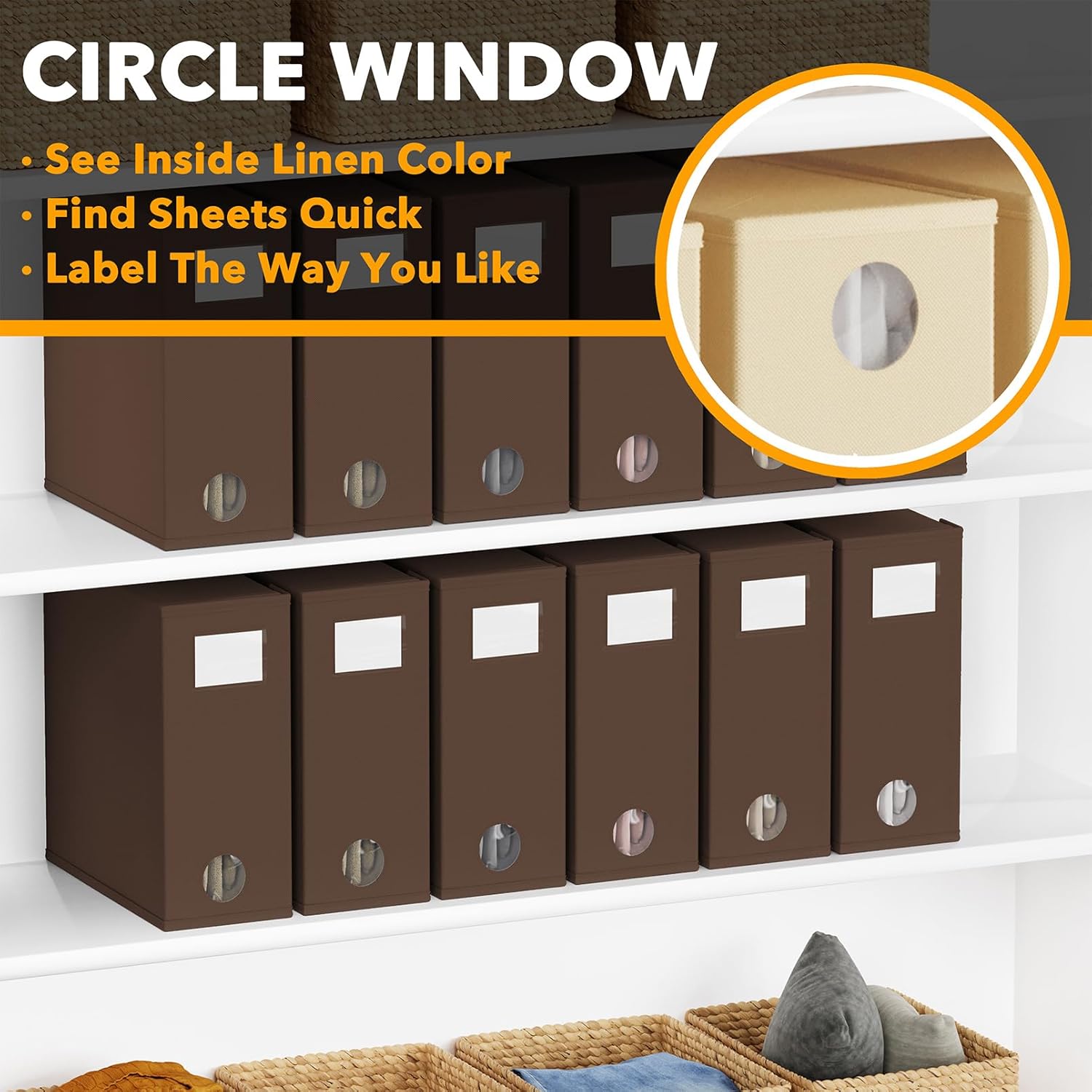 - CIRCLE WINDOW DESIGN - You can see the linen color clearly through the front circle window; This sheets organizer container is beautiful and modern that will fit any home style
