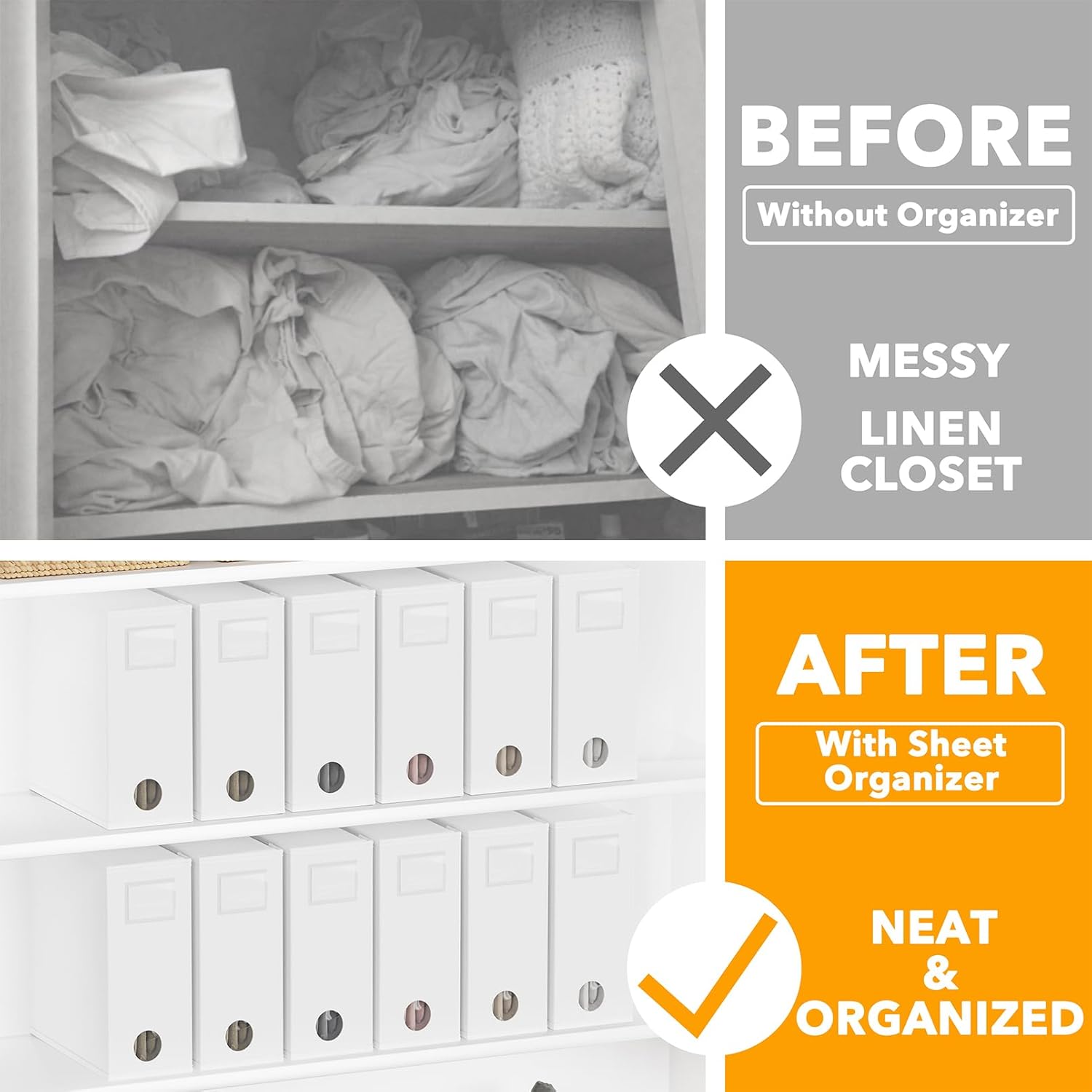 - WHITE SHEET ORGANIZERS 12 PACK - Make your linen closet organized and beautiful with this foldable bed sheet fabric organizer; Each Storage Organizer SIZE: 5"W x 15"D x 12.8"H