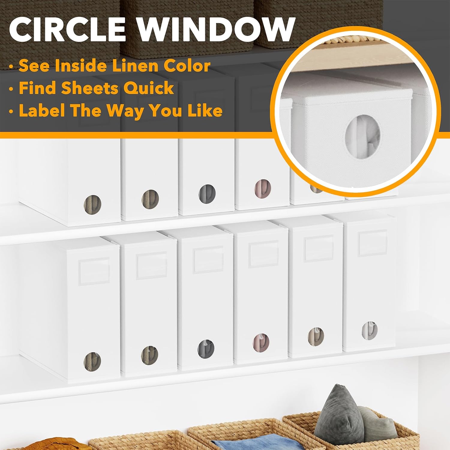 - CIRCLE WINDOW DESIGN - You can see the linen color clearly through the front circle window; This sheets organizer container is beautiful and modern that will fit any home style