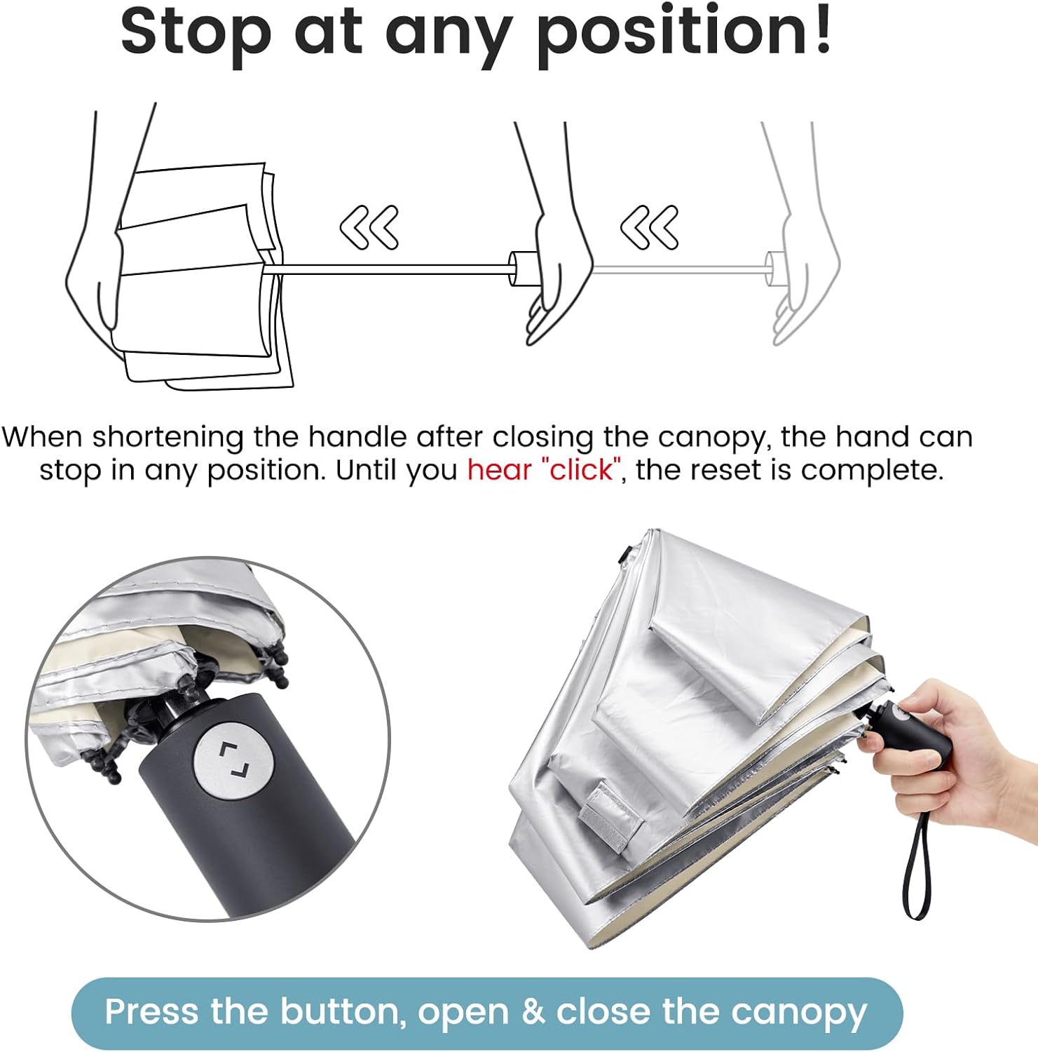 - 【Easy Automatic Open & Close With Safety Anti-rebound】The automatic umbrella can be operated with one hand. A special anti-bounce close function allows you to reset with very little pressure, and stop in any position without bouncing and hitting yourself. Remember to pull it back fully until you hear a click to complete the reset.