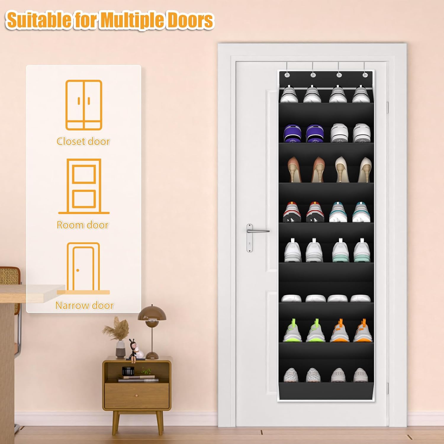 - Sturdy and reliable: The shoe rack door comes with 4 sturdy metal hooks that can hold up to 60 pounds. The hooks will fit doors from 1.37" to 1.65". Door shoe organizer hanging is perfect for most standard and narrow doors such as storage rooms, closets, college dorms, bedroom doors, laundry rooms, garages, etc