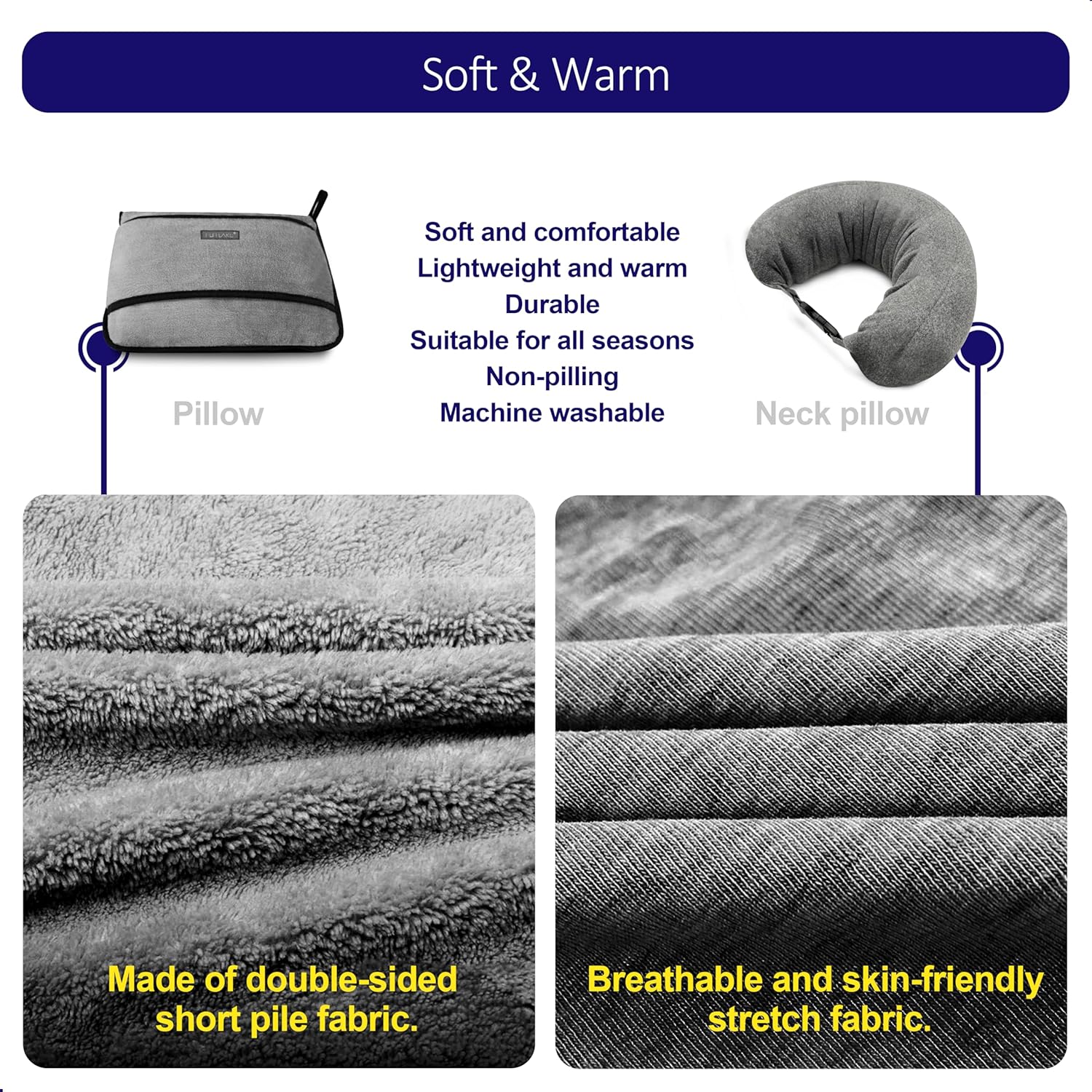 3-in-1 Travel Pillow Blanket Set - Soft Flannel Convertible Pillow, Blanket & Neck Pillow with Backpack Clip | Compact Travel Essentials for Airplane, Car, Office, Grey