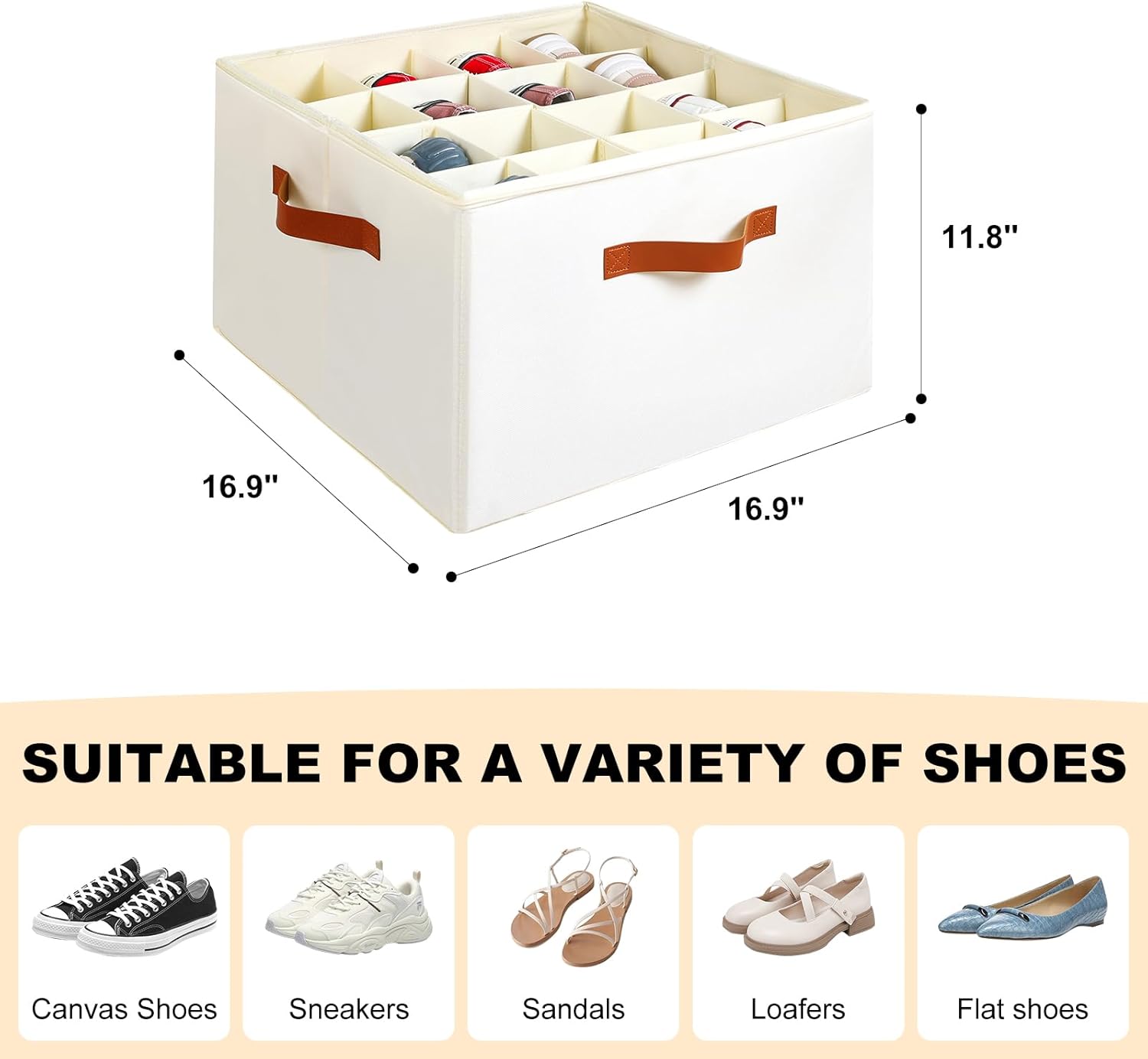 - LARGE SHOE STORAGE ORGANIZER - This Shoe Box Organizer with Dividers holds up to 16 pairs of shoes in your closet. Dimensions are 16.9''x16.9''x11.8'', with 16 compartments. Our shoe storage bag can be folded flat to save space when not in use. Space saving solution for homes of all sizes! It is suitable for bedroom, garage, attic, basement, and dormitory used.