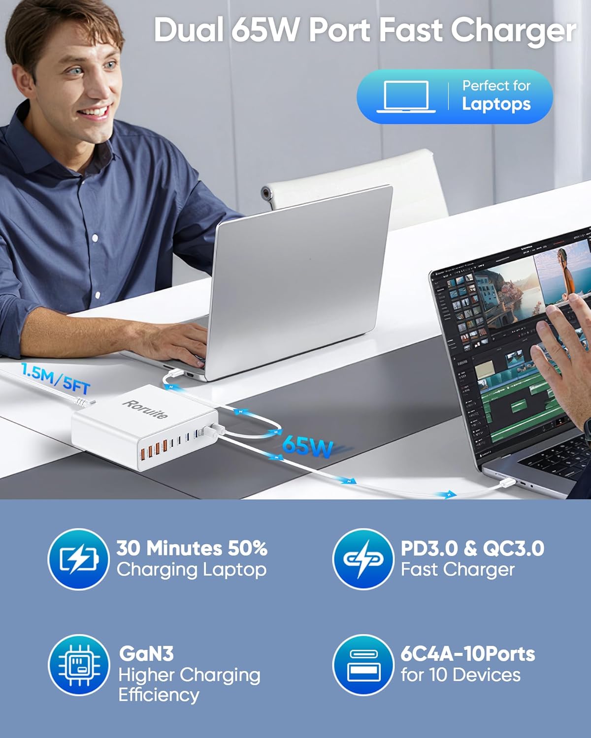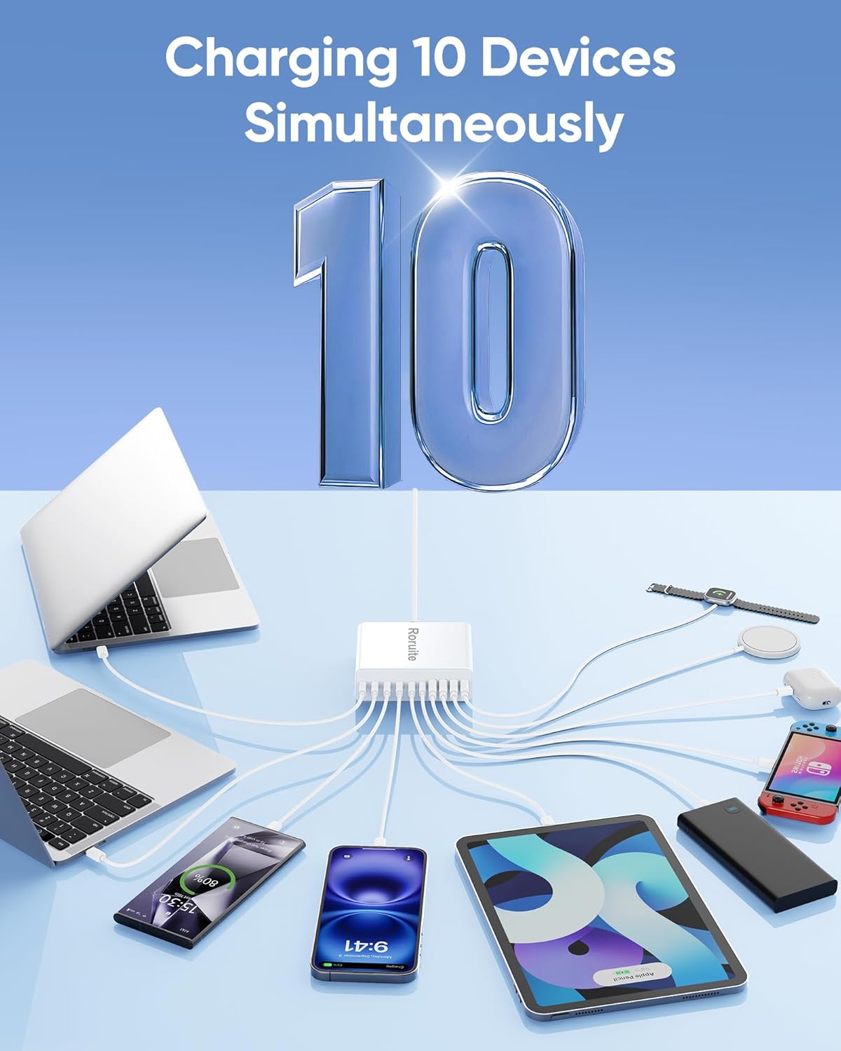 - ă10-Port USB Charging Stationă This USB C charger block from Roruite is the ultimate charging solution for multiple devices. Equipped with 6 USB-C charging ports and 4 USB-A charging ports, it offers a total output of 460W, allowing you to charge all your electronics simultaneously. Perfect for both home and office use, it saves you valuable outlet space and can support the charging needs of multiple people at once.