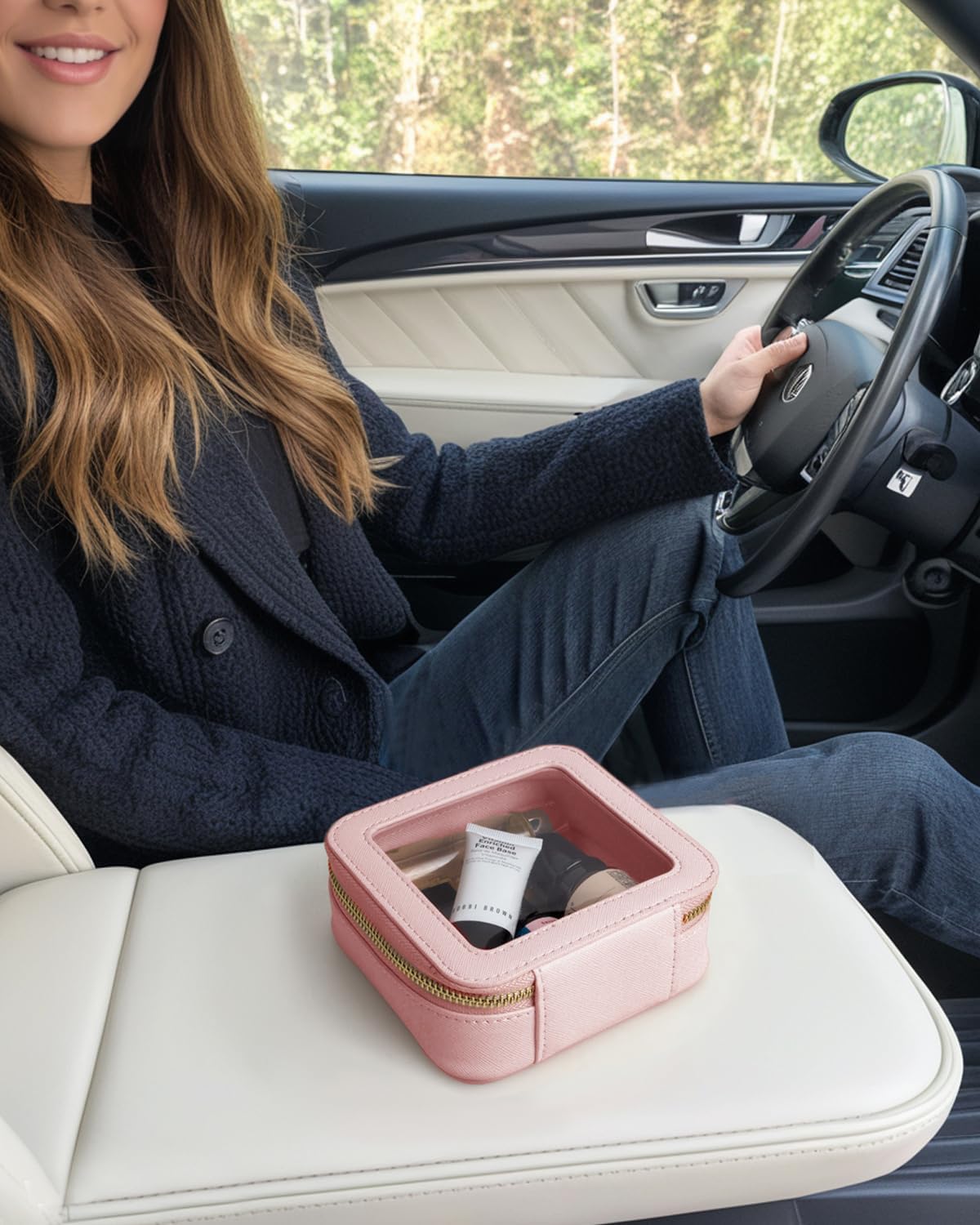 - Car Must Have Essential: Our car essentials small pouch travel toiletry bag is roomy to store your makeup brushes, lipstick, eyebrow pencil, make-up foundation, cables, chargersor and other little items.It make your daily make-up, cream, lipstick, perfume and other beauty things organized and protected.This clear mini toiletry bag can be a good car accessory fits in the center console or other parts of your car.