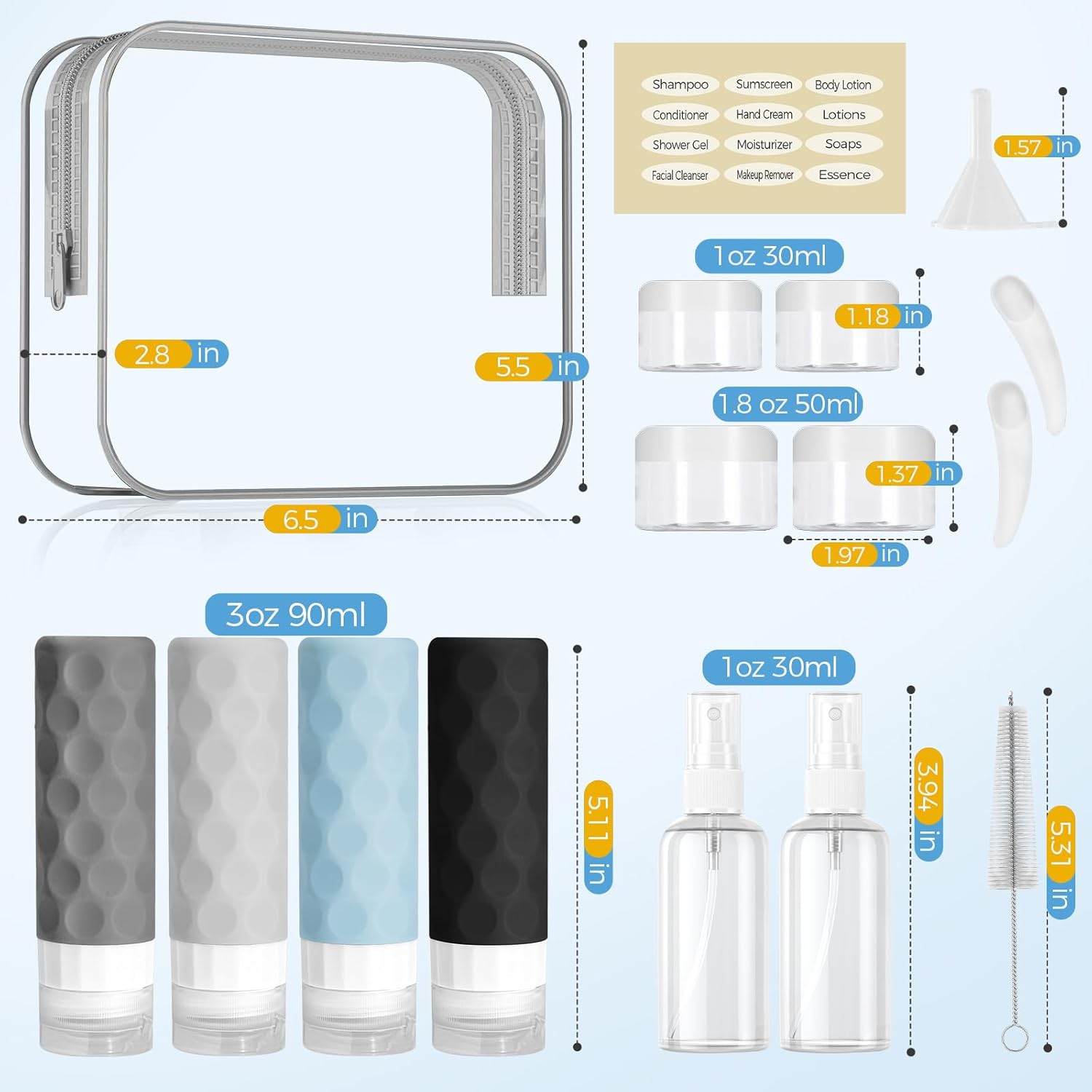 - 【16PCS Travel Toiletries Containers】This Travel Set includes 4 travel bottles, 4 travel jars, 2 spray bottles, 2 spoons, 1 funnel, 1 cleaning brush, and 1 printed label. It offers different accessories for your needs
