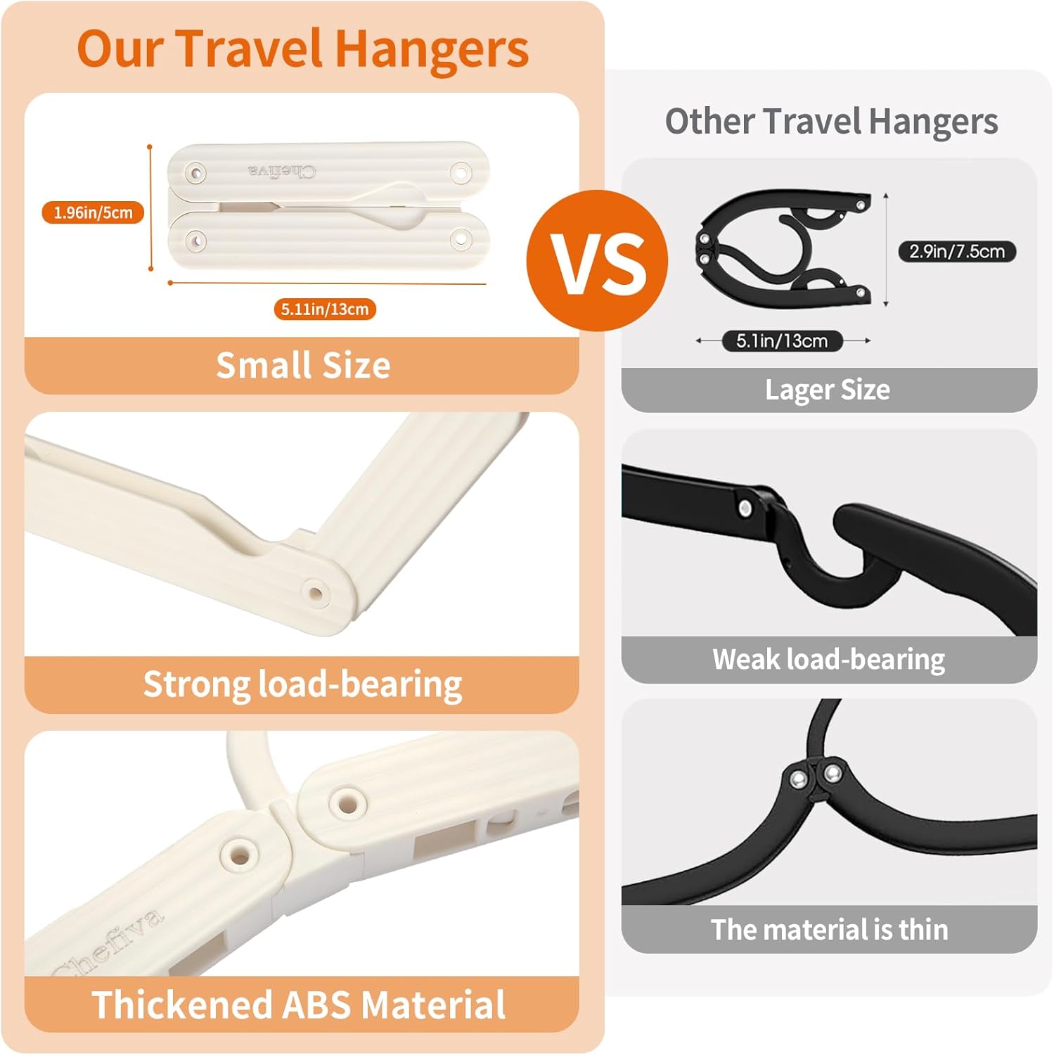 - 【Space-Saving & Compact Design】Chefiva foldable travel hangers collapse into a compact size of 5.1*1.96 inches,The travel hangers making them the ultimate space-saving solution for your suitcase or travel bag. the foldable hangers Perfect for cruise ships, RV trips, and vacations where every inch of luggage space matters.