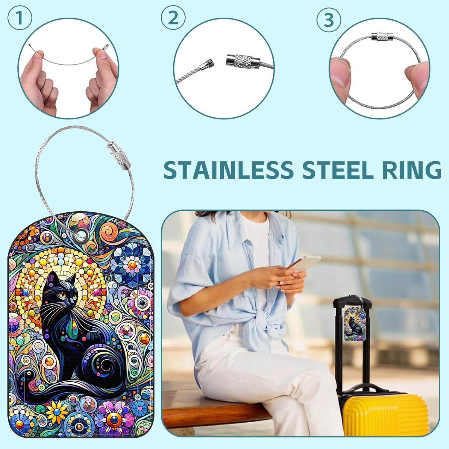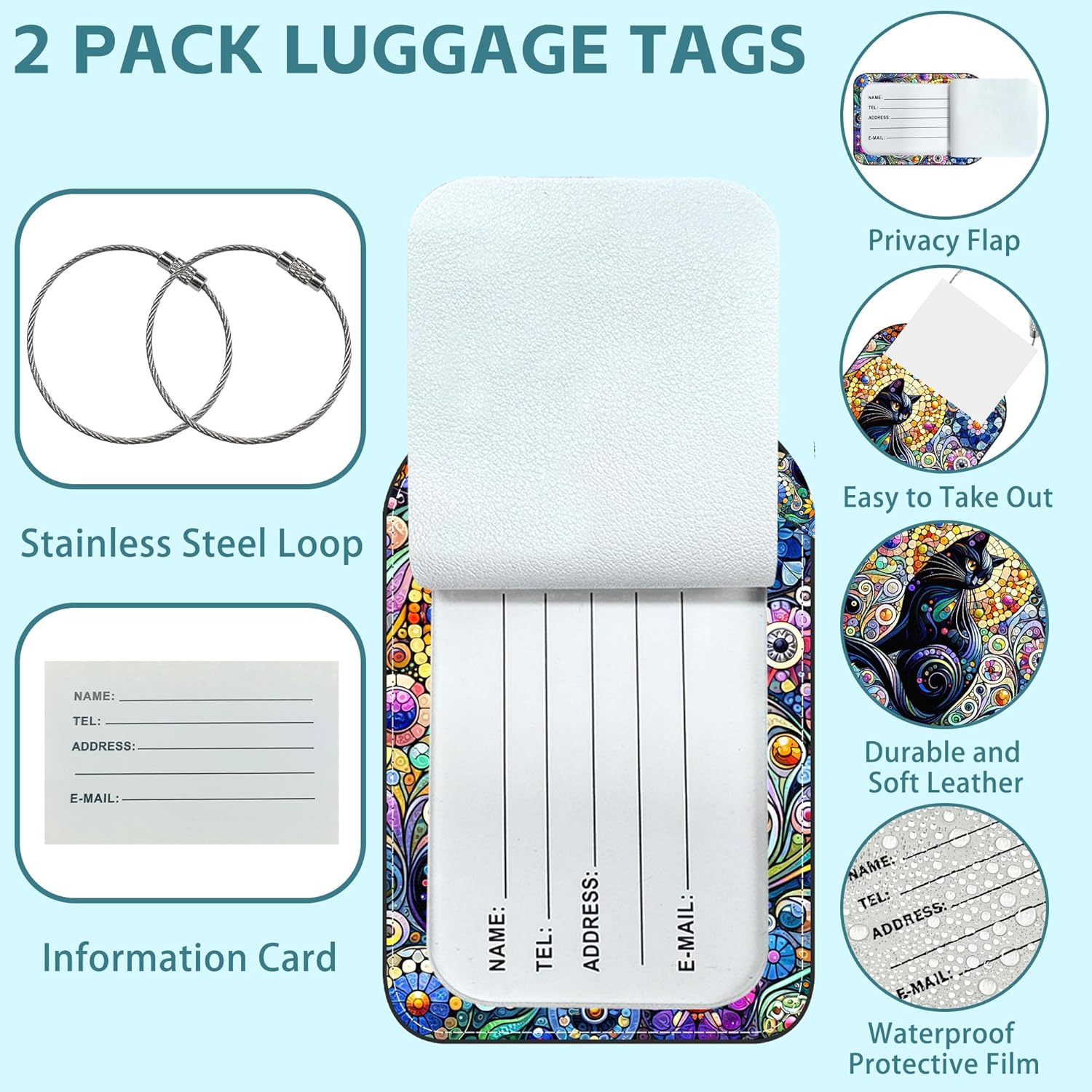 2 Pack Cute Luggage Tag for Suitcases Black Cat Leather Luggage Tags with Stainless Steel Loop Privacy Flap Name Tags,Men and Women Travel Bag Suitcase Tags