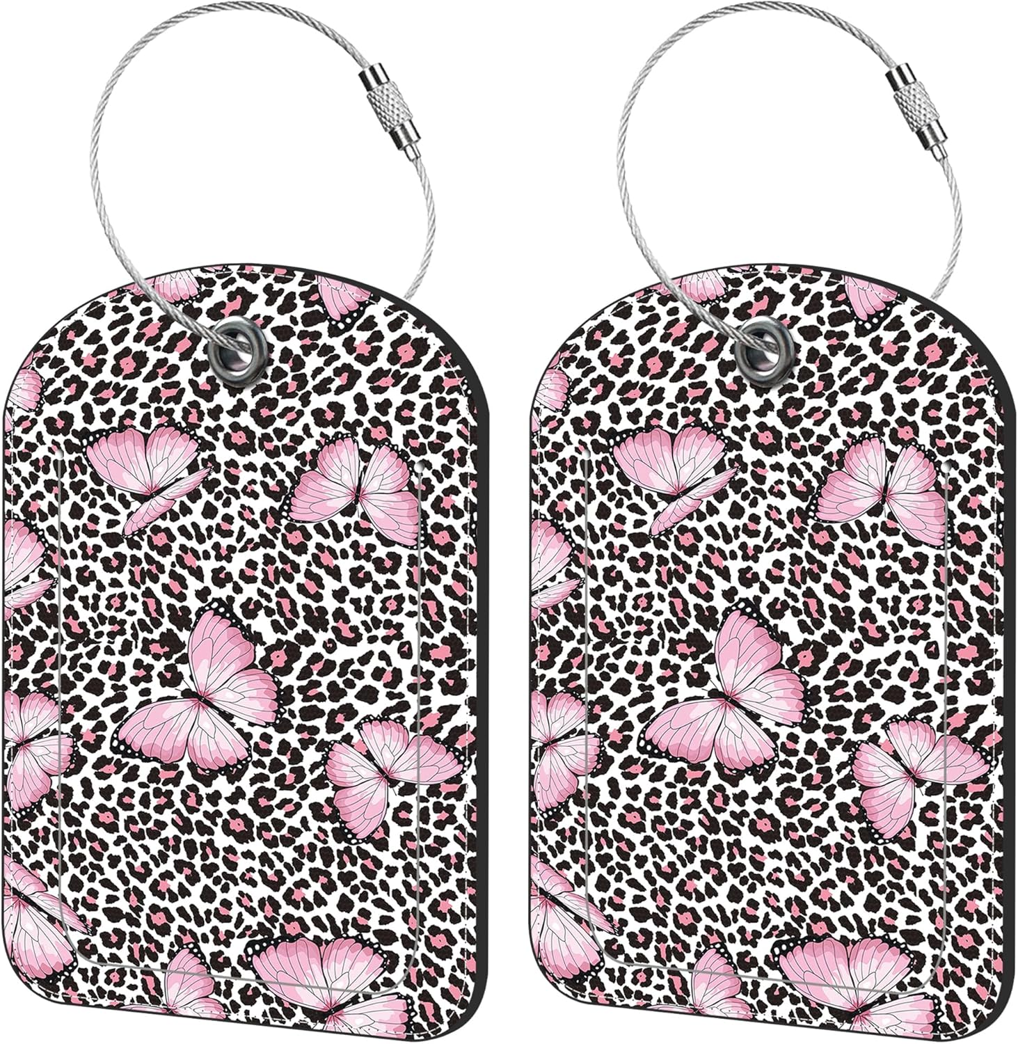 2 Pack Cute Luggage Tag for Suitcases Pink Butterfly and Leopard Leather Luggage Tags with Stainless Steel Loop Privacy Flap Name Tags,Men and Women Travel Bag Suitcase Tags