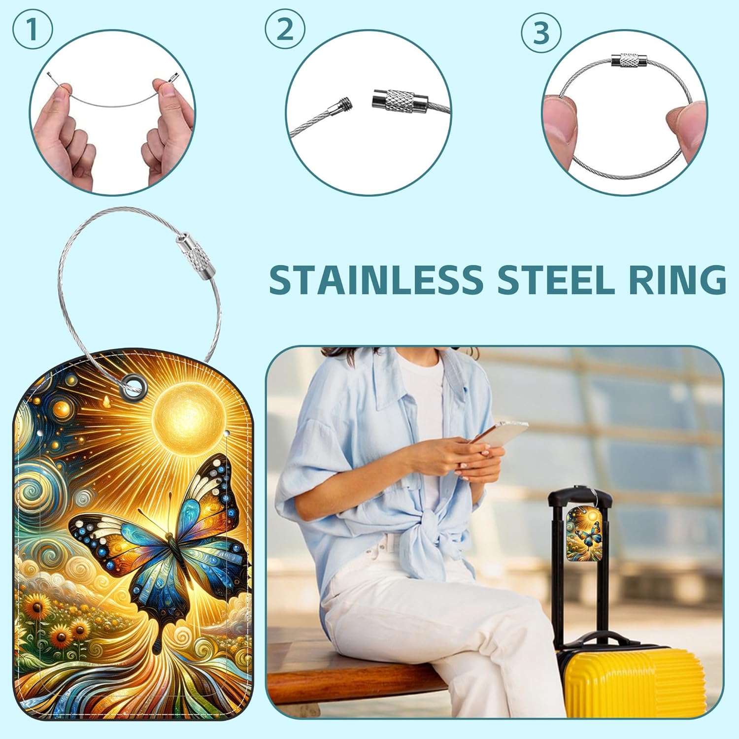 2 Pack Cute Luggage Tag for Suitcases Colorful Butterfly Leather Luggage Tags with Stainless Steel Loop Privacy Flap Name Tags,Men and Women Travel Bag Suitcase Tags