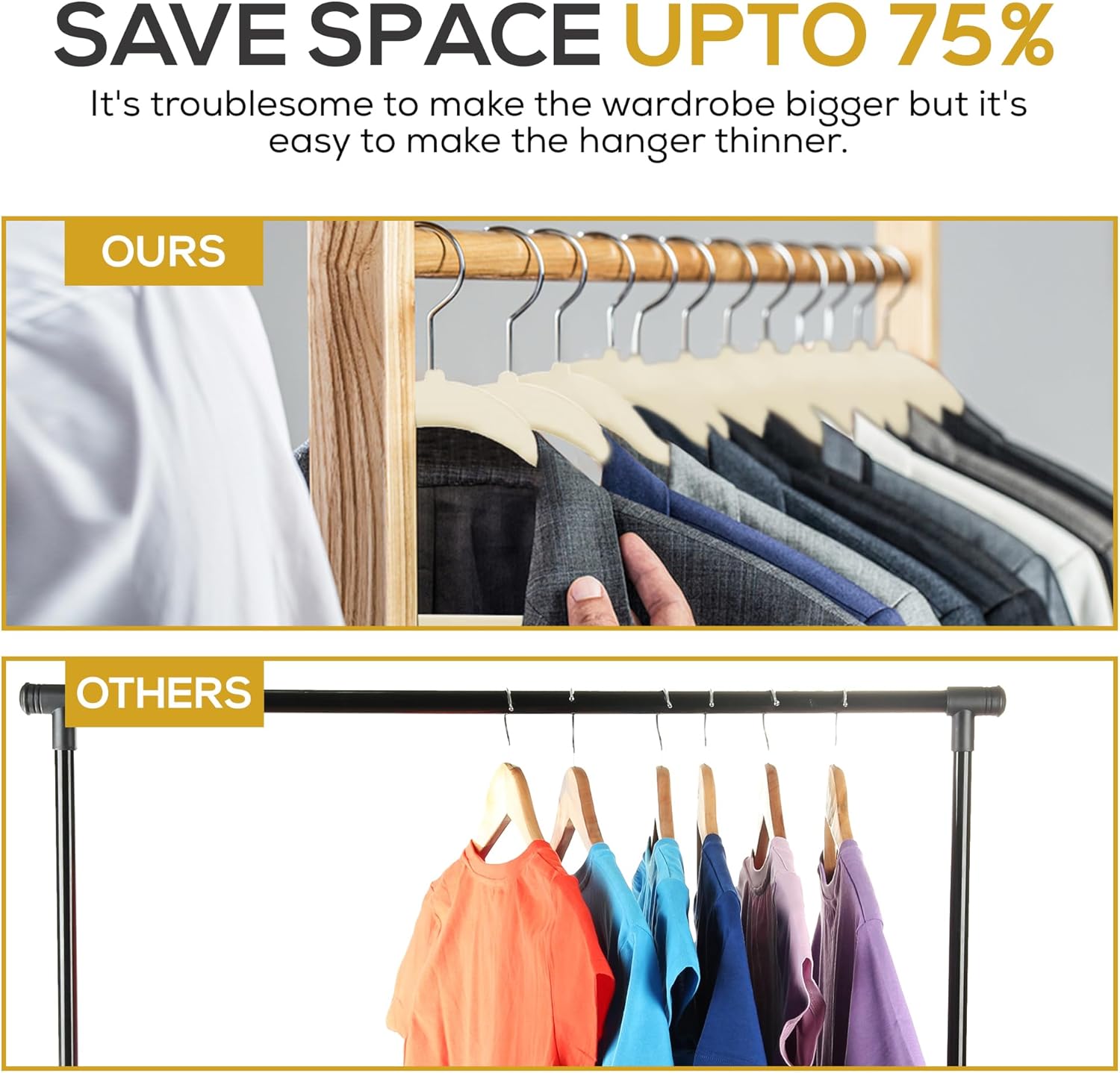 - Maximize Your Closet Space – Transform your wardrobe with ultra-thin ivory velvet hangers that are only 0.2" thick, giving you up to 75% more storage compared to bulky coat hangers. Perfect for a neat, clutter-free closet with space-saving hangers. Each hanger measures 17.7"L x 9"H and features a 360 degree swivel galvanized metal hook for easy sorting and hanging.